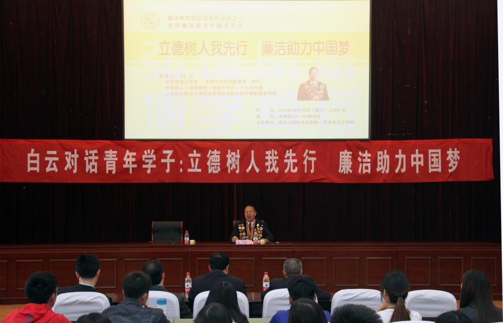 报告会上,白云以自己30多年的工作经验和人生阅历为基础,以“爱”为主线,围绕“立德树人我先行廉洁助力中国梦”的主题,从爱党、爱国、爱民讲起,到爱岗、爱学习、爱己、爱家、爱廉、爱美德,生动形象的总结出“九爱”和青年学子进行心与心的交流,向大家详细阐述了白云之“人”、白云之“路”、白云之“心”。他在报告过程中用朴实无华的语言道出了自己对人生对工作对生活的深刻理解,比如“爱党”就是要听党的话,坚持党的领导,要感谢党,跟党走,时刻牢记如果没有共产党就没有新中国,就没有今天的好日子;要真正做到“爱民”就必须拥有“煤炭精神”、“蜡烛精神”、“老黄牛精神”和“楷模精神”,要“舍得出力、舍得出汗、舍得出血”;讲到“爱廉”时,他将自己的成功归结为始终坚持“不管东西南北风,咬定廉洁不放松”,并以实际案例警示同学们要始终遵守法律法规,坚守道德底线。白云还特别讲道,作为一名党员,应该时刻牢记使命,认真对待党的事业和人民的事业,始终把党和人民的利益放在首位、放在心上。最后,白云鼓励大家要珍惜来之不易的昨天、把握充满机遇的今天、拥抱美好灿烂的明天,珍惜大学时光,多读书、勤思考,积极进取,做一个对国家、对社会的有用之才。希望大家树立远大理想,坚守道德底线,坚持法律红线,从我做起,从校园做起,不管将来为师、从政,都做一个干干净净、清清白白、有益于人民的人。同学们被白云的精彩报告和崇高品格深深吸引,产生强烈共鸣,现场不时爆发出阵阵热烈的掌声。