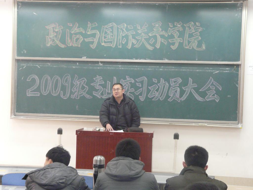 1月14日下午,政治与国际关系学院2009级非师范专业实习动员大会在长清校区教学楼B127教室召开。政治与国际关系学院政治学系副主任于光胜、团总支副书记、2009级辅导员孙茂泉以及2009级政治学与行政学专业、哲学专业全体同学参加了会议。会议由孙茂泉主持。
