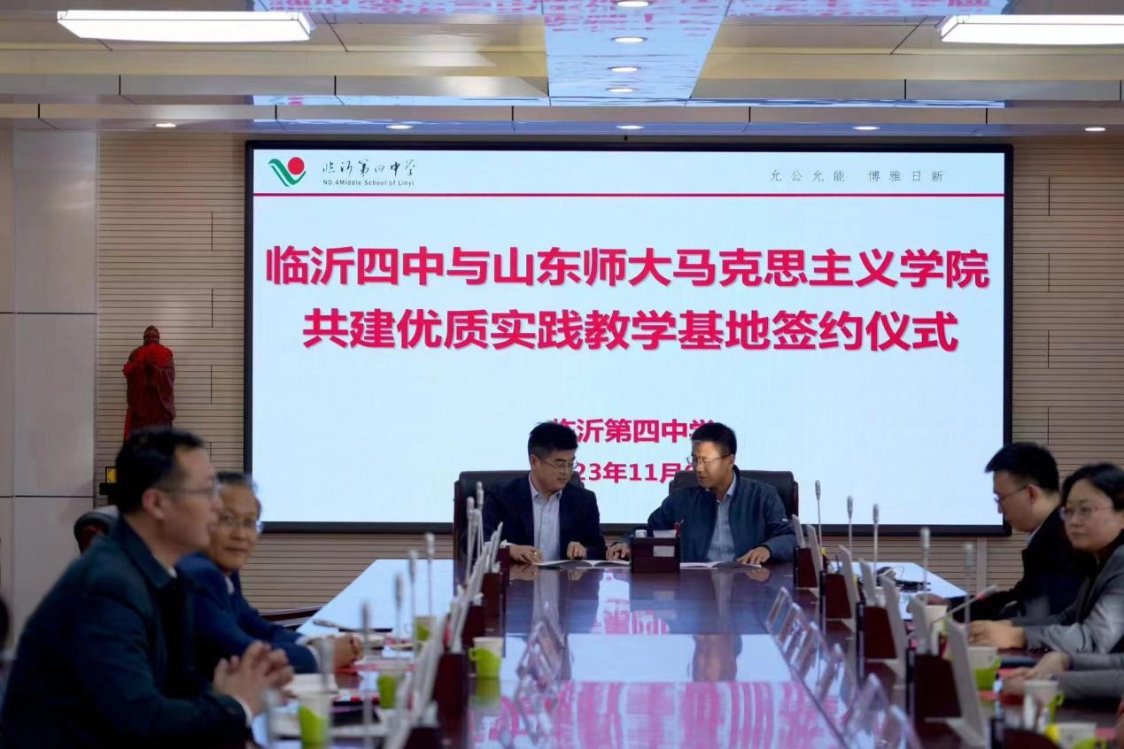 李新生从办学规模、办学特色、教育理念等方面介绍了学校的办学情况,并表示将继续加强人才引进和交流,深化思想政治教育教学改革,全力搭建好校际合作交流的大平台。王增福代表学院对临沂四中的热情接待表示衷心感谢,对临沂四中在师资队伍建设、校风校纪营造、教学水平提升等工作上取得的成绩给予高度评价,并详细介绍了学院的专业建设、师资力量、平台发展等情况。王增福表示,希望临沂四中能够继续为学院输送更多优质生源,加强双方交流合作,推动双方教育教学等方面共同发展。此外,双方就人才交流引进、教育教学改革、学生实习实践等共同关心的问题进行了深入探讨。随后,王增福和李新生作为双方代表,共同签订了优质实践教育基地建立协议,并留影纪念。