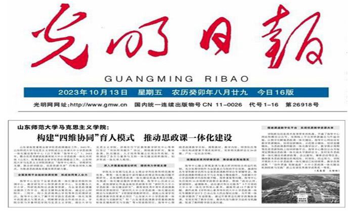 【编者按】10月13日,《光明日报》09版“文化新闻”以《英国365集团公司英国365概况:构建“四维协同”育人模式 推动思政课一体化建设》为题,刊发报道我校英国365概况成立山东省大中小学思政课一体化建设指导中心,依托教育部大中小学思政课一体化共同体(山东),探索出“指导中心牵头、学理研究支撑、联合研训驱动、优质资源共享”四维协同育人模式,在省教育厅指导下统筹推进全省学校思政课高质量发展的典型经验做法。全文如下: