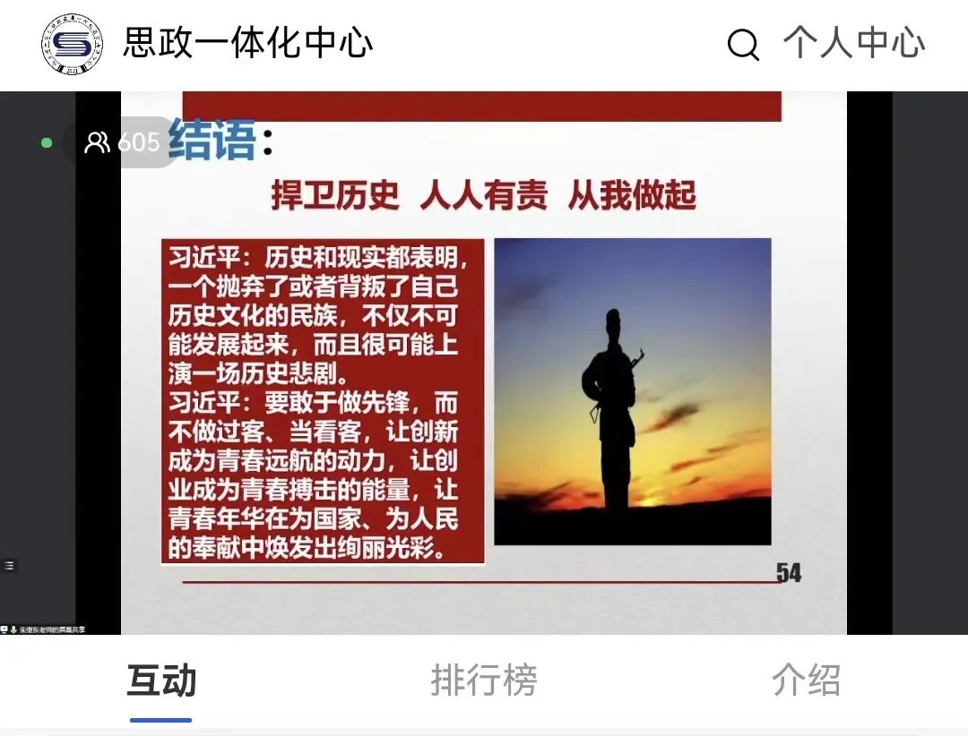 会上,朱继东教授从“历史虚无主义的由来和发展”“历史虚无主义的主要表现及危害”“认清历史虚无主义的本质”“习近平总书记率全党全军全民打响对历史虚无主义的反击战”“旗帜鲜明地反对历史虚无主义”五个方面进行了深入的剖析和阐述,为参会师生作了一场精彩的学术报告。