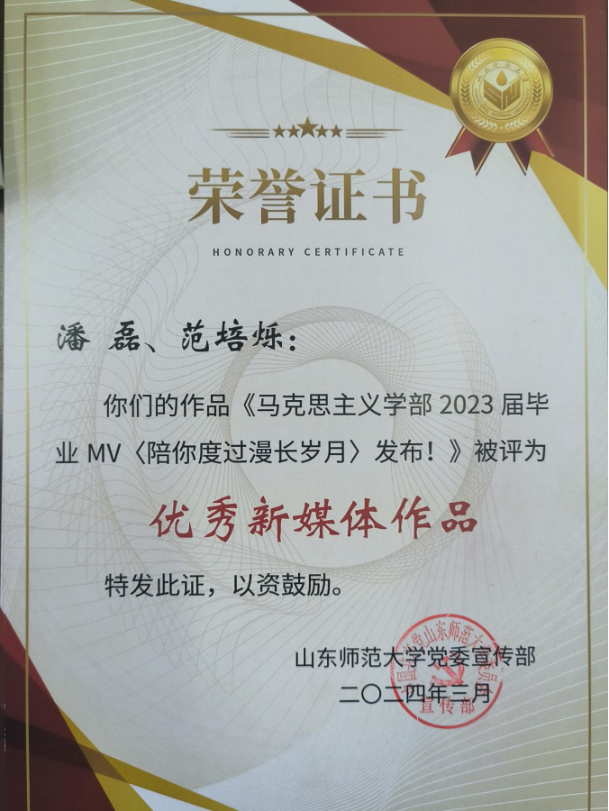 近日,学校公布了2023年度英国365集团公司宣传思想文化工作先进集体和个人评选结果。学部获评先进单位;官方网站荣获2023年度优秀二级网站;2人获评“宣传思想文化工作先进个人”;5位同学被评为“新媒体工作先进个人”;3位同学入选2023年度《山东师大报》十佳学生记者、通讯员;山东师大马院团委公众号推出的作品《365英国上市2023届毕业MV〈陪你度过漫长岁月〉发布!》、《上岸率90%!学霸班级是怎样炼成的?》获评2023年度优秀新媒体作品,成果斐然。