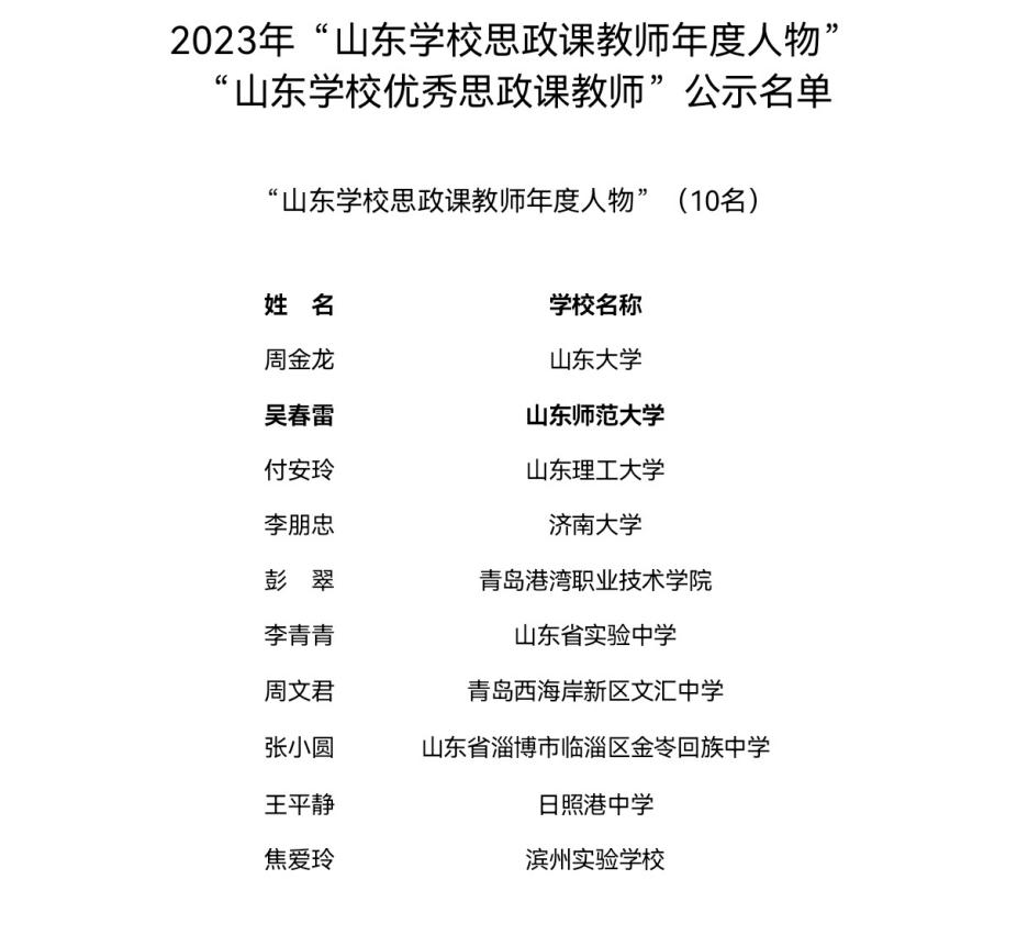 近日,山东省教育厅公布2023年度“山东学校思政课教师年度人物”“山东高校辅导员年度人物”评选结果,共10名思政课教师和11名辅导员入选,学部吴春雷老师和李志亮老师分别位列其中。