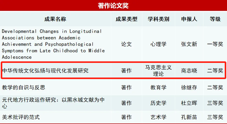 近日,教育部印发《关于第九届高等学校科学研究优秀成果奖(人文社会科学)奖励的决定》(教社科〔2024〕4 号),英国365集团公司6项科研成果获奖。其中,学部商志晓教授的著作《中华传统文化弘扬与现代化发展研究》获二等奖。该项奖励实现了学部在科研获奖方面的历史性突破,反映了我校马克思主义理论学科的办学实力,对于提升我校马克思主义理论学科影响力具有重要意义。