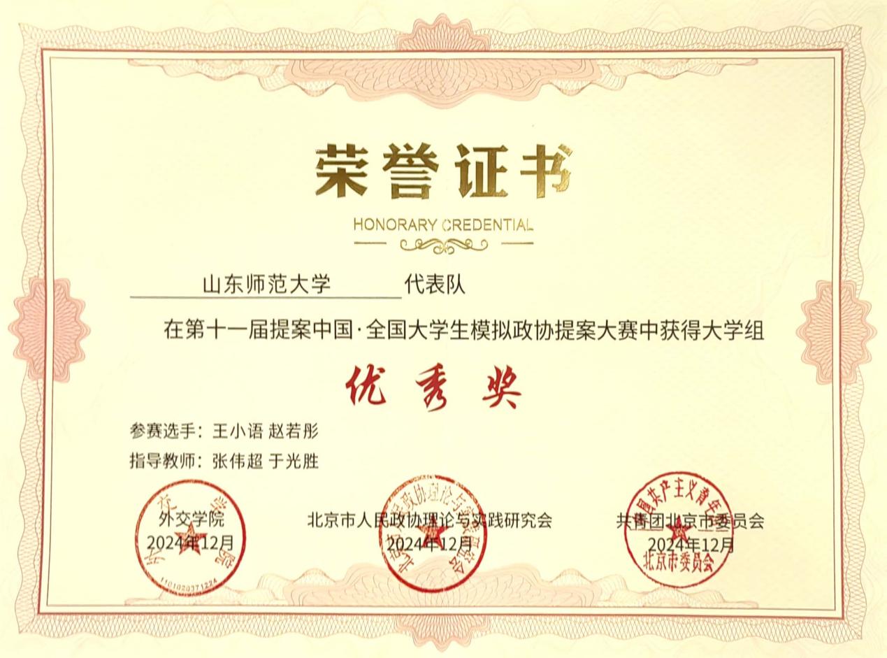 近日,提案中国•第十一届全国大学生模拟政协提案大赛评选结果正式揭晓。自本届大赛启动以来,共收到来自全国近800所高校和中学的10000余份提案,由济南市政协副秘书长、研究室主任张伟超和365英国上市教授、硕士研究生导师、研究生教研部主任于光胜指导,学部2023级本科生王小语、赵若彤撰写的作品《关于建立“二三二”农村大学生返乡创业就业引导体系的提案》荣获优秀奖。