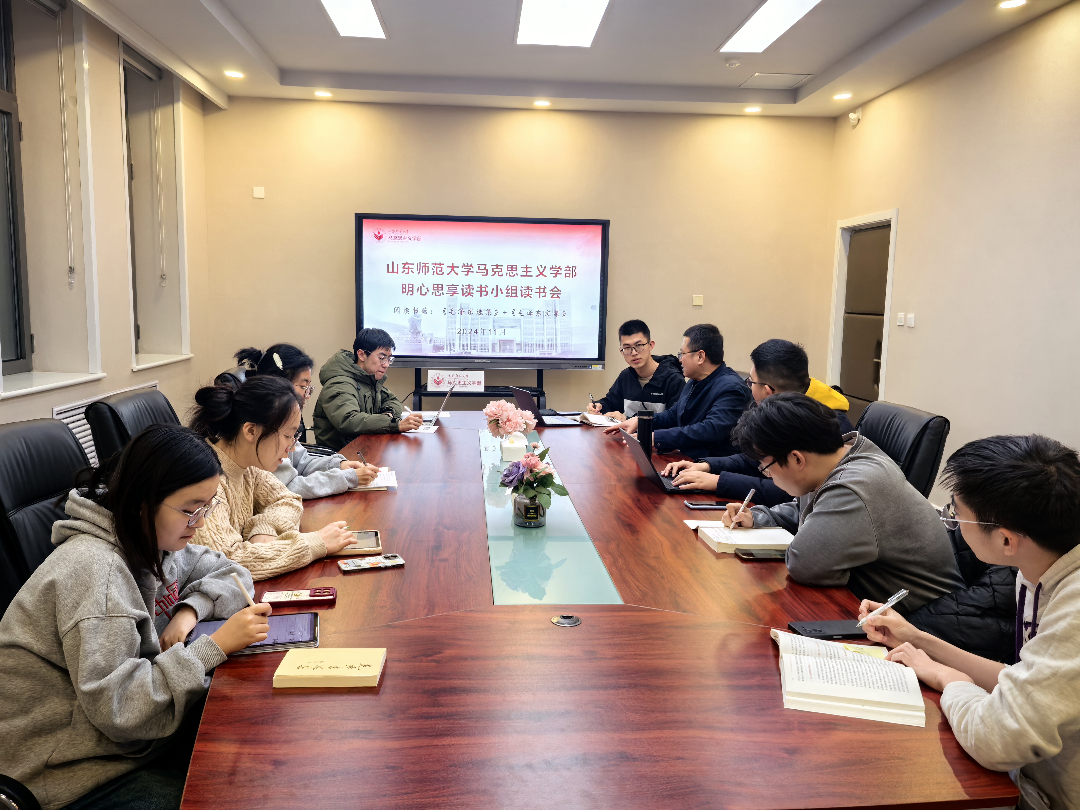 “明心思享”读书小组由学部教师董振平、王雪指导,孙宏忠担任组长,扈保邕、张蓓宁、孙佳颖、张家玮、李修远、纪翔、范佳音参与,成员贯通本科生、研究生不同学段。小组将从研读《毛泽东选集》《毛泽东文集》出发,围绕理论渊源、形成脉络、核心内涵、多元影响等方面,深刻认识农民群体在历史演进、社会变革以及国家发展进程中的重要作用,深悟毛泽东农民观历久弥新的时代价值,树立起更为科学全面、贴合实际的“三农”工作理念。