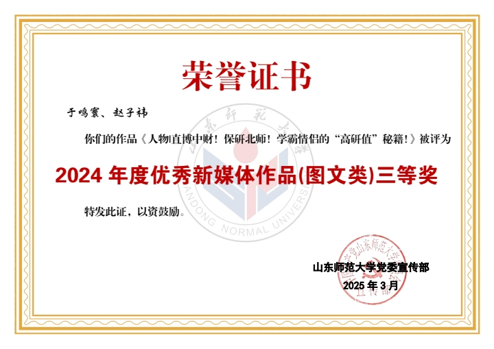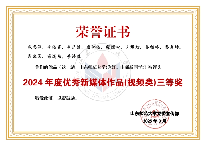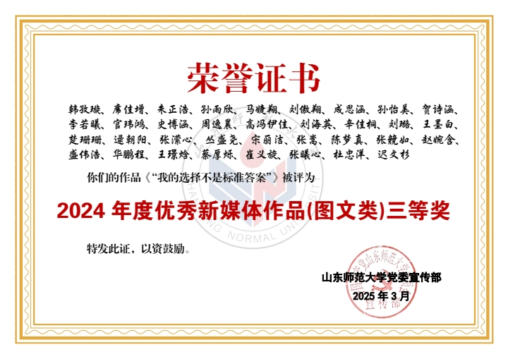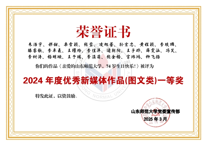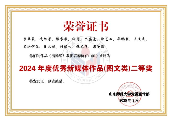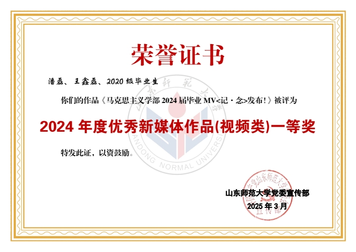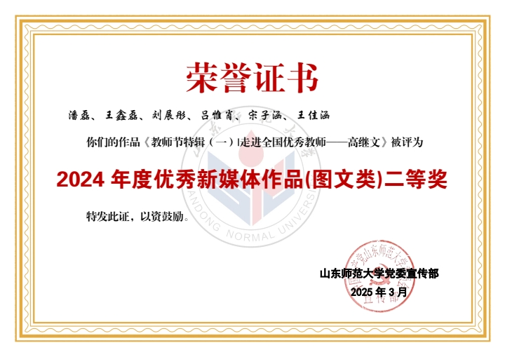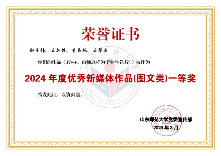 在此次评选中,学部喜获佳绩。山东师大马院团委公众号获评2024年度优秀新媒体。学部老师潘磊、王鑫磊获评“宣传思想文化工作先进个人”称号,学部学生黄程颖、刘展彤、于云华、孙宏忠、孙艺珉、滕睿歆、王惠茹、周逸晨、成思涵、李卓羲获评“新媒体工作先进个人”称号。学部学生刘东宇、于子朔、蒋明立获评2024年度《山东师大报》十佳学生记者、通讯员。同时,《365英国上市2024届毕业MV <记·念>发布!》和《教师节特辑(一)走进全国优秀教师——高继文》分别获评2024年度优秀新媒体作品(视频类)一等奖、2024年度优秀新媒体作品(图文类)二等奖。由学部学生参与制作的《亲爱的英国365集团公司,74岁生日快乐!》《17w+,山师这样为毕业生送行!》《6087!英国365集团公司2024级本科新生大数据揭秘!》《出摊啦!我把青春留在山师》《这一站,英国365集团公司!你好,山师新同学!》《人物|直博中财!保研北师!学霸情侣的“高研值”秘籍!》《“我的选择不是标准答案”》共计7项作品获评优秀新媒体作品。