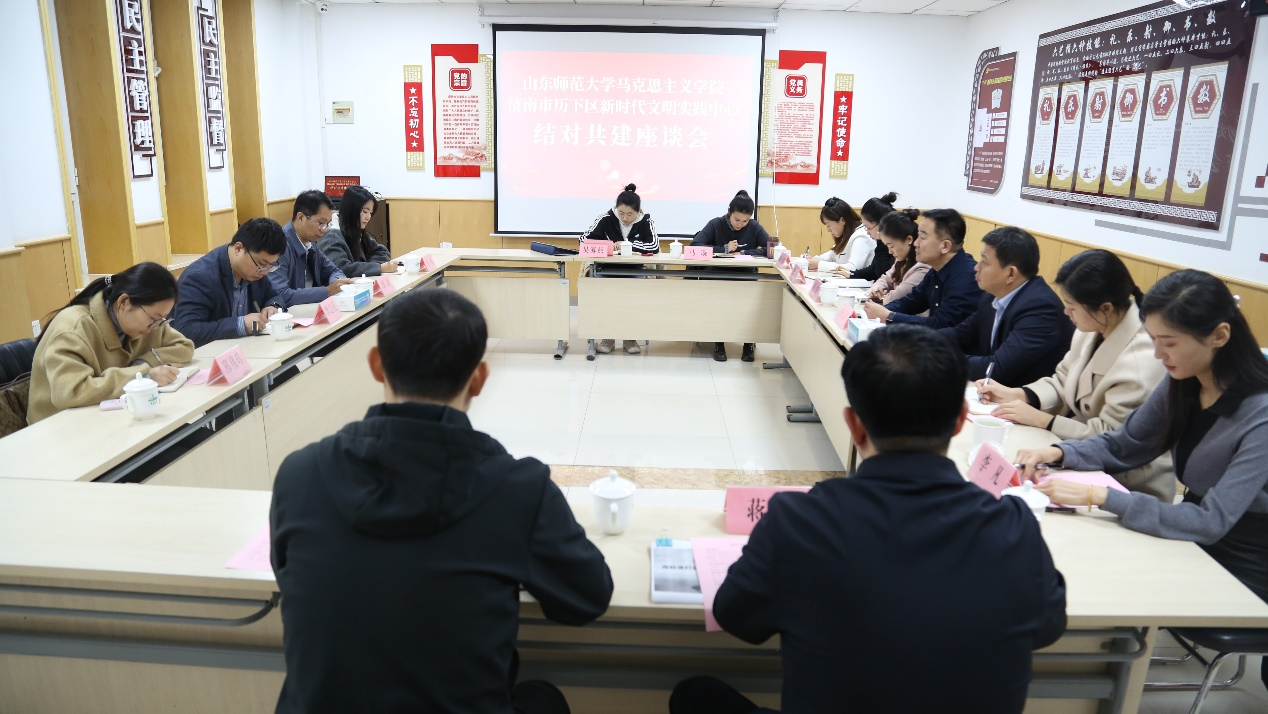 参观结束后,双方就校地双方结合工作实际,围绕新时代文明实践如何深度融合基层治理、服务群众需求等议题展开座谈交流。毕伟东介绍了历下区新时代文明实践中心(所、站)三级联动总体布局,提出积极精准对接,共同推动习近平新时代中国特色社会主义思想在基层传播,助推精神文明建设。刘斌和李志亮表示,学院将发挥自身专业优势,结合社区需求和结对共建要求,让理论在基层落地扎根,同时促进双方资源互换,建立共建长效机制。