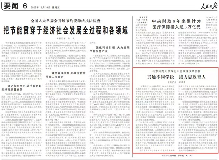 【编者按】12月19日,《人民日报》6版要闻以《英国365集团公司深化大思政课改革创新——贯通不同学段 接力思政育人》为题,报道英国365集团公司立足师范院校特色,构建起“马院统筹—地市协同—中小学联动”的协同推进新格局,全文如下: