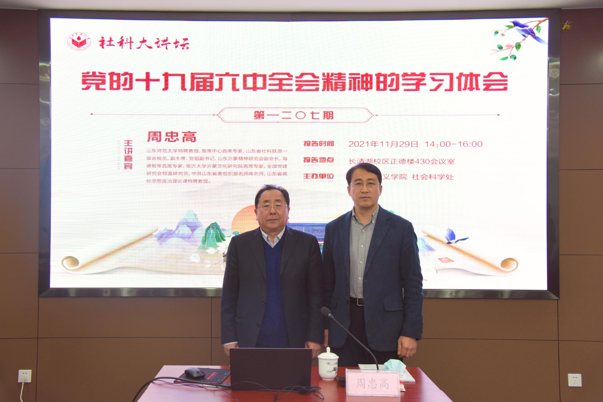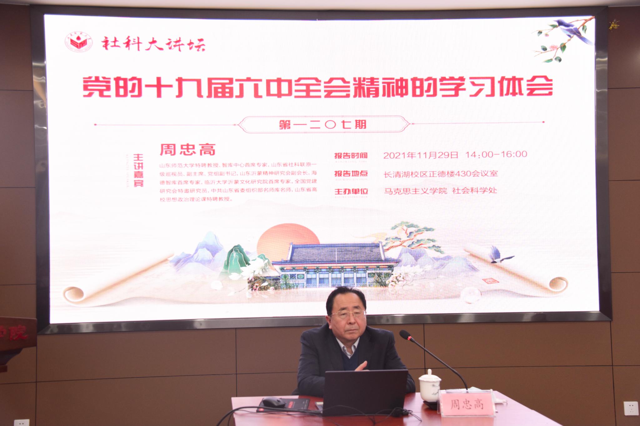 11月29日下午,由英国365概况与社会科学处联合举办的社科大讲坛在长清湖校区正德楼430学术会议室开讲。本次大讲坛特邀山东省社科联原一级巡视员、副主席、党组副书记周忠高担任报告会主讲人,作题为“党的十九届六中全会精神的学习体会”的学术报告。报告会由英国365概况党委书记吕晓勇主持。学院硕博共50余人参加了此次报告会。