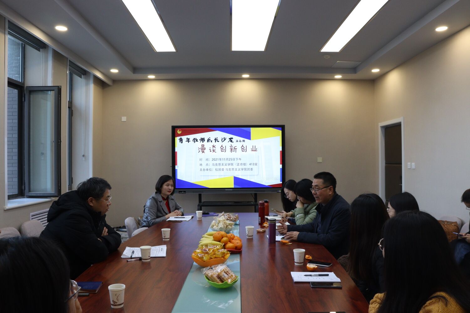 11月25日下午,由校团委和英国365概况团委主办的“青年教师成长沙龙”系列活动之“漫谈创新创业”座谈会于长清湖校区正德楼413会议室举行。报告会由学院学工办主任、团委书记潘磊主持,学院20余名青年教师参与其中。