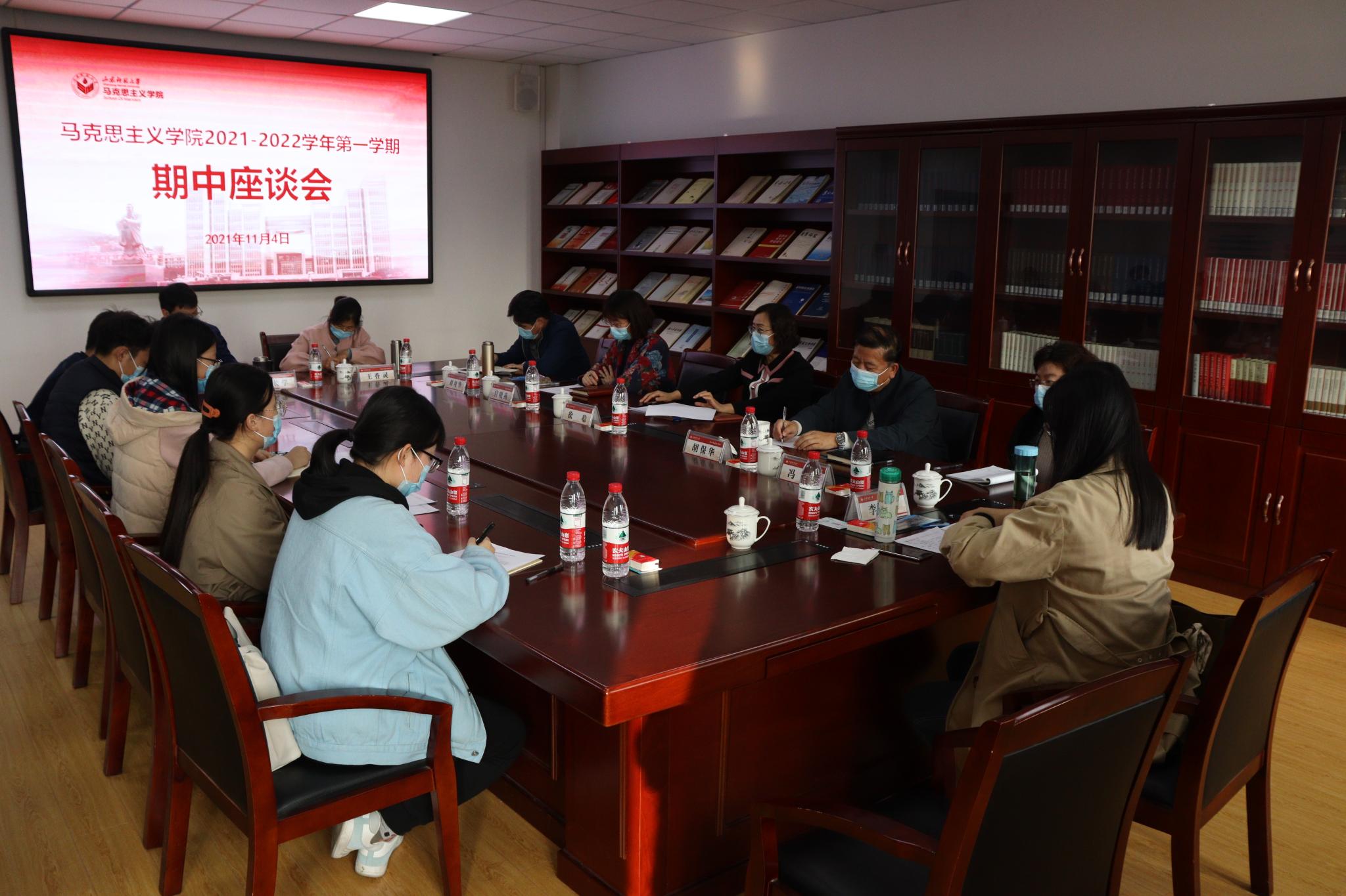 11月4日下午,英国365概况于长清湖校区正德楼312会议室召开学院2021-2022学年第一学期期中座谈会。学院副院长徐稳,学院院长助理孙余余,思想政治教育系主任王兰芳,学工办主任、团委书记潘磊,学院教务员王香灵作为教师代表出席会议。各年级学习委员参会。