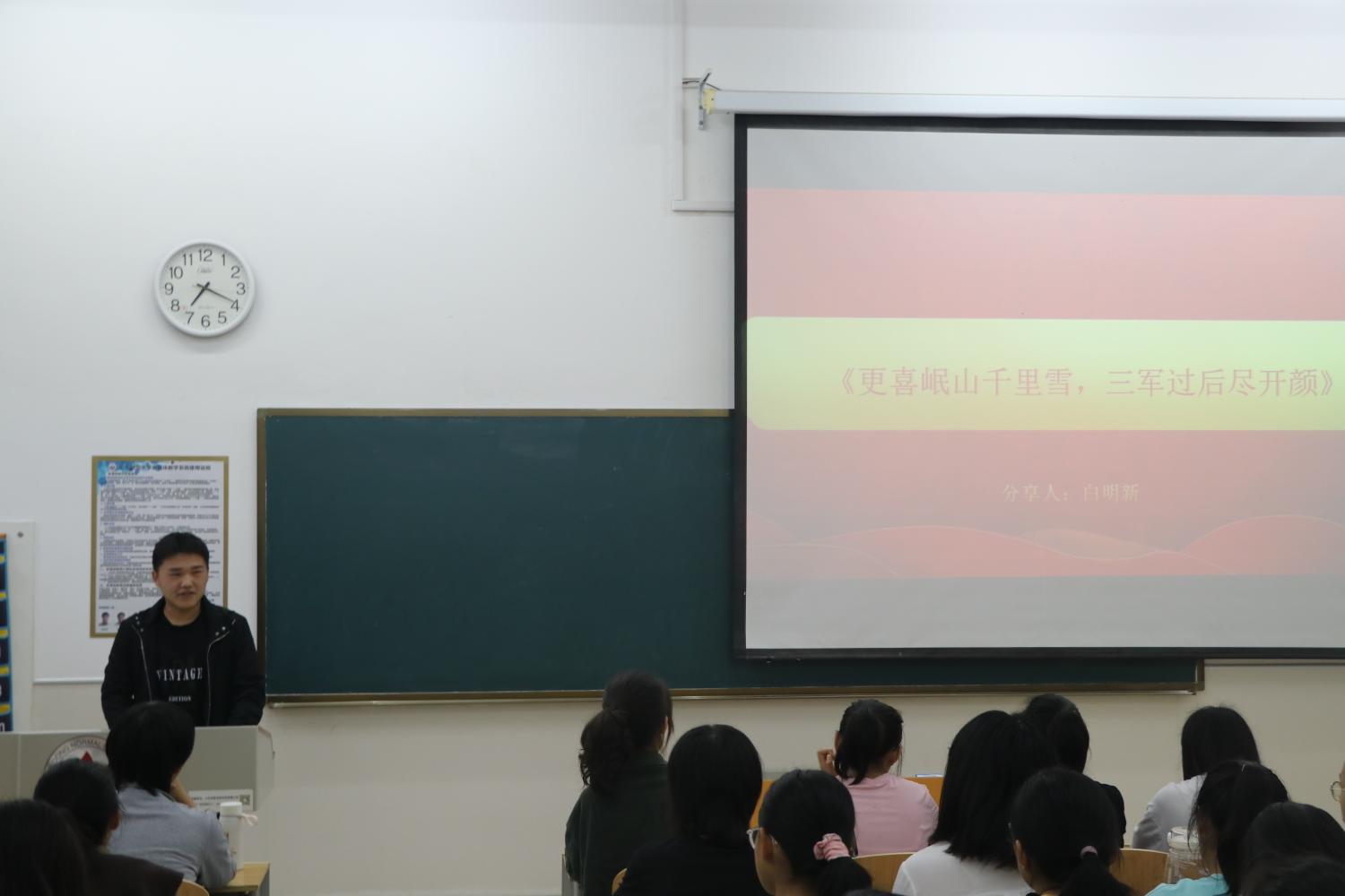 会议伊始,2020级思师班的吴梓煜首先带来题为《从金沙江战役看红军长征的胜利》的主题演讲。他以金沙江战役的视角切入,讲述了红军战士们在党的领导下与当地群众默契配合取得前进主动权的故事,带领与会同学重温那个惊心动魄、振奋人心的时刻。随后,2020级思政二班黎承鑫将与会同学的视线聚焦到意义重大的湘江战役。他以时间顺序为轴梳理事件细节,展现了红军将士们坚如磐石的理想信念和百折不挠的革命意志。他感慨到:“那些倒下的红军战士们愿意为他们梦想中的共产主义世界而献出生命、义无反顾,他们是最可爱的人。”最后,2020级思师班白明新以《七律长征》中诗句“更喜岷山千里雪,三军过后尽开颜”为分享主题,号召在座同学要不断继承和弘扬长征精神,以更加积极的态度投身到今后的学习和工作中去。2021级思师二班的姜欣欣也在会后谈到她的感悟:“听了这次红色故事分享,我更加为长征路上的红军战士们,为我的祖国骄傲。作为一名青年学子,我要从党史中汲取前进的智慧和力量,坚定理想信念,砥砺初心,走好新时代长征之路!”