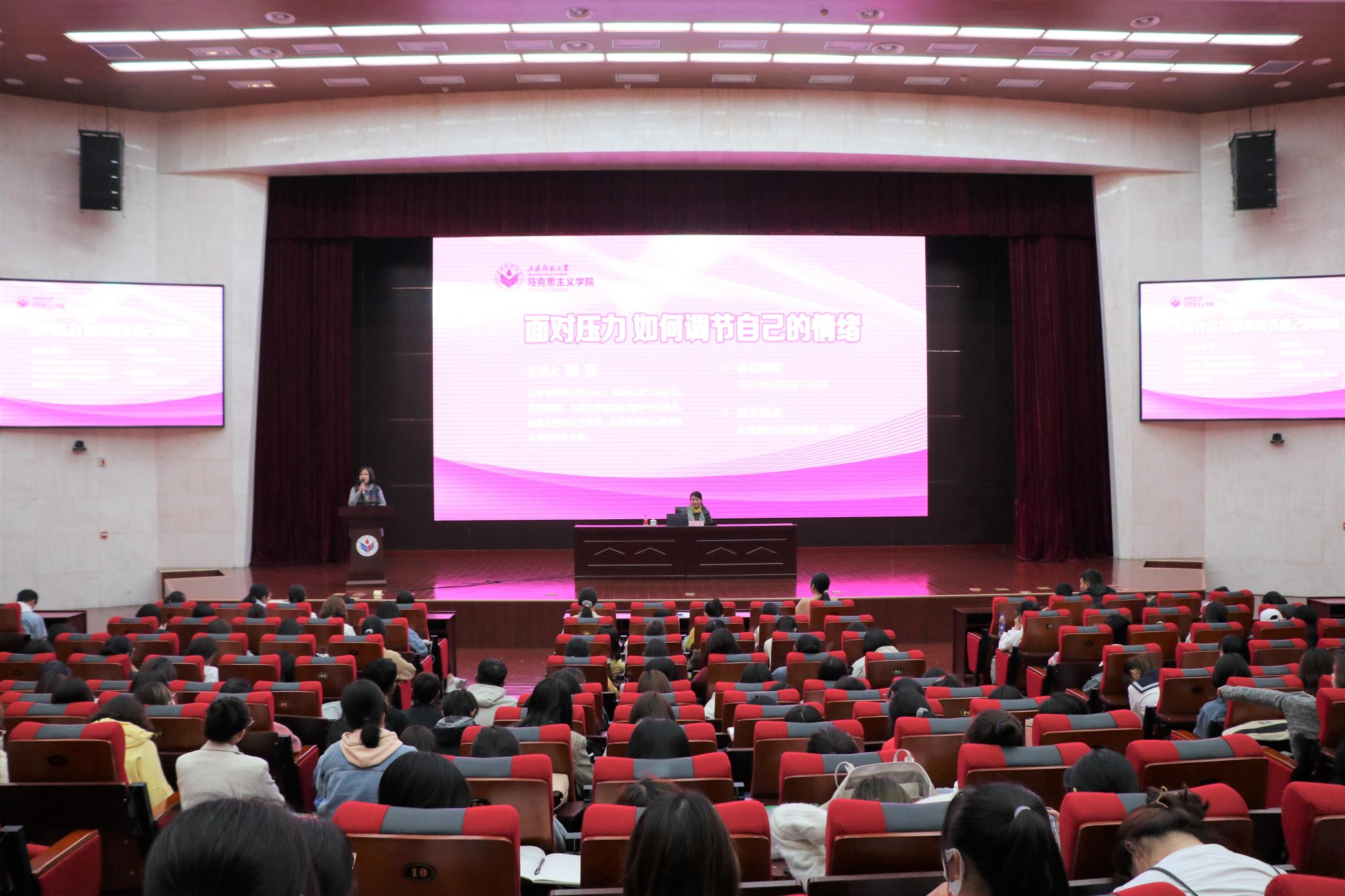 4月8日晚,英国365概况于长清湖校区树蕙堂第一报告厅举办“面对压力,如何调节自己的情绪”报告会。学院邀请山东省精神卫生中心,临床心理二科主任,英国365概况德育导师胡蕾担任主讲人,学院团委书记、学工办主任潘磊主持会议,400余名本科生共同与会。
