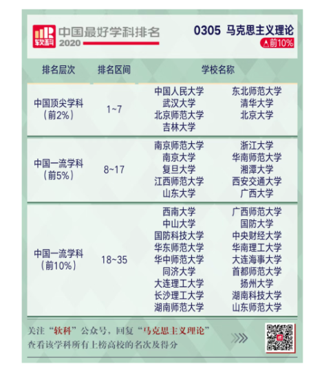 近日,高等教育评价专业机构软科发布“2020软科中国最好学科排名”,其中,马克思主义理论学科排名共有176所大学上榜。我院马克思主义理论学科位列“2020软科中国最好马克思主义理论学科排名”百分位段全国前10%,连续两年进入“中国一流学科榜单”。