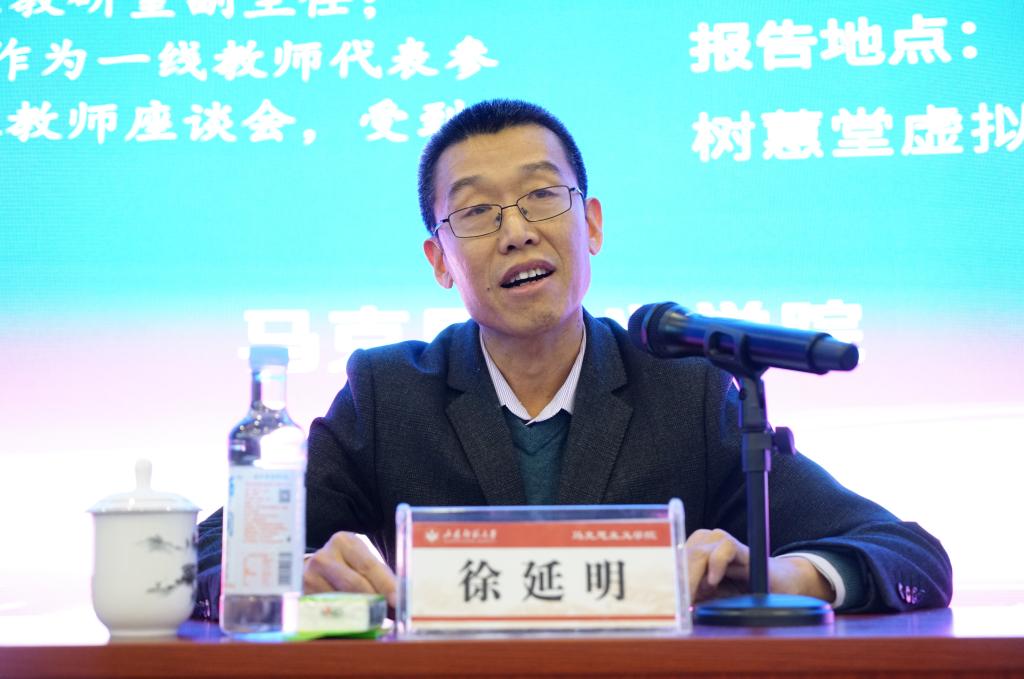 徐延明首先回忆了大学期间的授课恩师以及老师们给予的谆谆教导,对母院多年的培养和关怀表示感谢。他以自身经历告诉同学们,大学期间不能虚度光阴,要“咬定青山不放松”,努力学习全方位提升自己。随后,徐延明结合自己二十多年的基础教育思政课老师经验,告诉同学们,在基础教育中思政课程的重要性,作为一名光荣的思政课教师要常怀使命感,在教学过程中,要将思维专注于学科本质,让思政课走进学生心灵,寻找道德教育的突破口,要引导学生将个人发展与国家、民族的发展融合在一起。最后,徐延明告诉同学们要为自己成为一名思政课教师感到骄傲,勉励学生不畏困难,积极进取,敢于突破,做一名合格的思政教师。