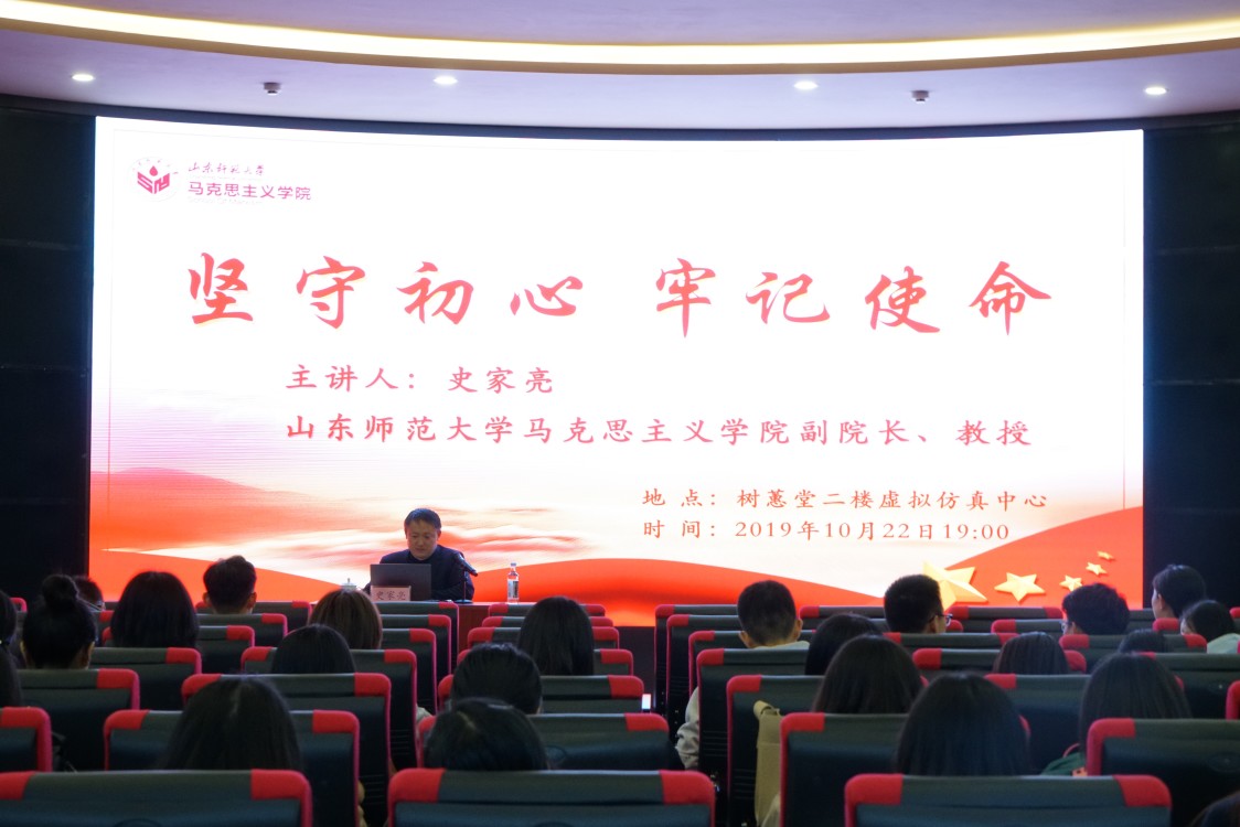 10月22日晚,英国365概况于长清湖校区树蕙堂二楼虚拟仿真中心举行“坚守初心,牢记使命”报告会。本次报告会由学院副院长、教授史家亮担任主讲人,2018级辅导员刘霄、组织员孙蕾、学院部分党员及第五十九期党基班全体学员参加此次报告会。