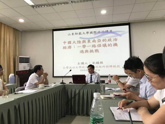 6月22日,台湾成功大学政治学系特聘教授、东亚发展暨治理研究中心主任、东南亚研究中心主任宋镇照教授做客我校社科大讲坛,为我院师生带来“中国大陆与东南亚的政治经济:‘一带一路’倡议的机遇与挑战”的专题报告会,吸引了四十多位师生到场聆听。报告会由马建英副教授主持。
