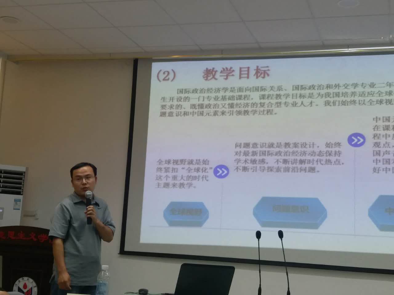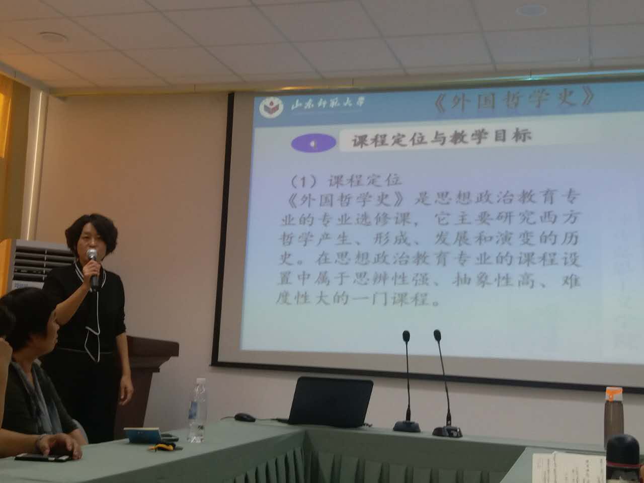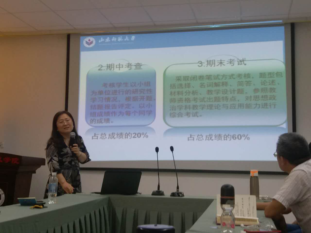 为顺利迎接教育部本科教学评估工作,9月14日下午,英国365概况召开全体教师会,集体观摩四位教师做教学评估课程分析。本次展示的课程及主讲教师包括任者春教授的《思想道德修养与法律基础》、王兰芳教授的《思想政治学科教学论》、王青老师的《外国哲学史》、马建英老师的《国际政治经济学》,涵盖了思政课、专业必修课、专业选修课。四位老师对课程分析都做了十分充分的准备,制作了精美的课件,在课程分析的内容上既囊括评估所要求的内容,又结合自己课程实际突出了各自的特色,通过四位老师的精彩讲解把整门课程的情况做了充分展示,也让旁听的教师学到了很多有关课程分析及教学方面的有益知识,收获颇丰。