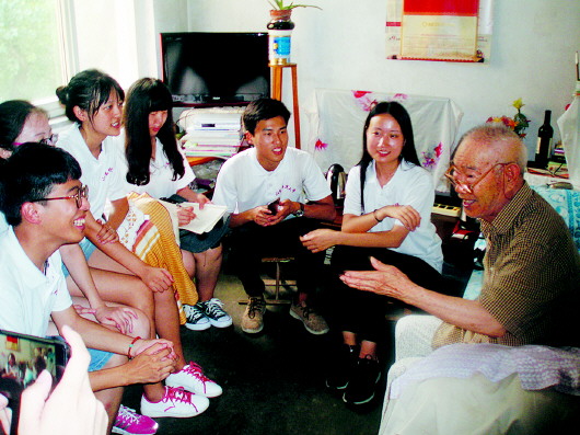 为纪念抗战胜利70周年,山师思政卓越班利用暑期探访青岛抗战老兵,图为听杨榴老人讲他的抗战经历。