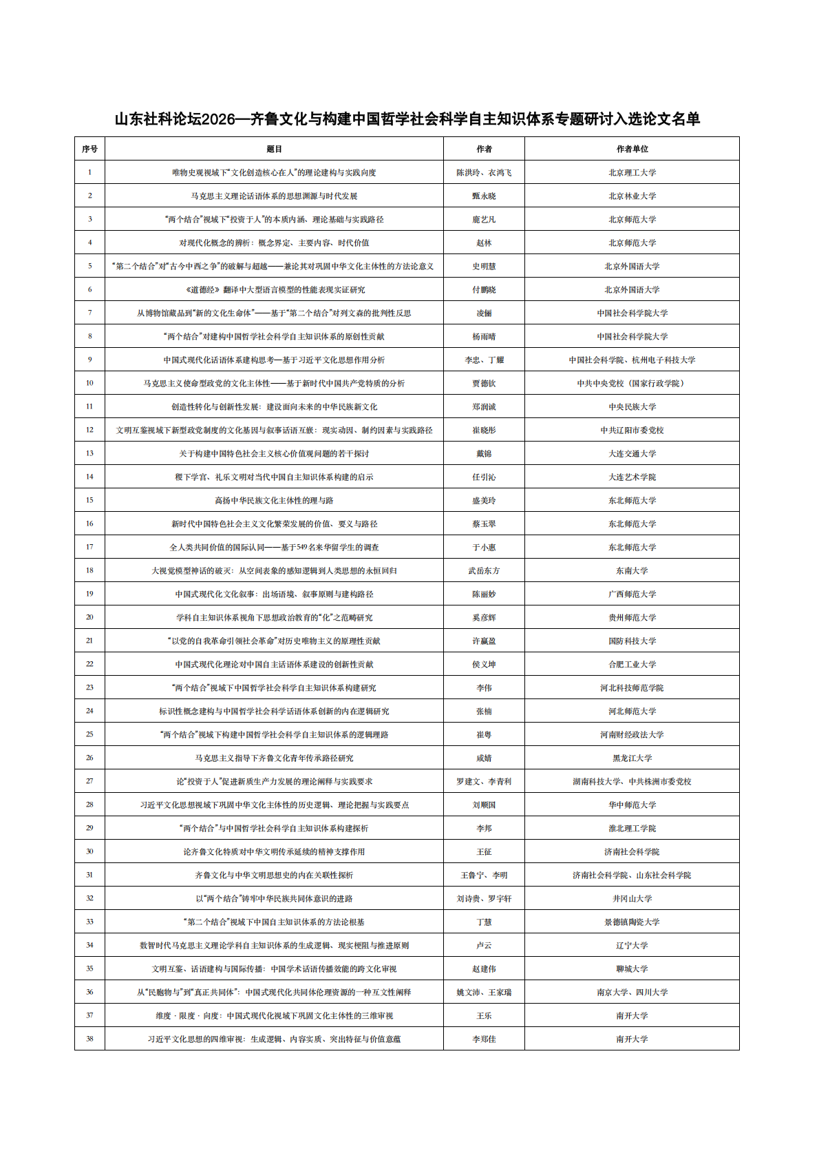 由山东省社会科学界联合会主办、英国365集团公司承办的山东社科论坛2026——齐鲁文化与构建中国哲学社会科学自主知识体系专题研讨自发布征稿通知以来,得到了全国200余所高校、党校及科研院所马克思主义理论及相关学科师生的广泛支持和关注。截至2026年4月6日24时,共收到有效稿件二百余篇。经过专家评审组初审、复审和终审,共评出入选论文111篇,具体名单参见附件。请入选作者于4月11日(周六)中午12点前加入QQ群:1094665407,后续工作将在群内发布。
