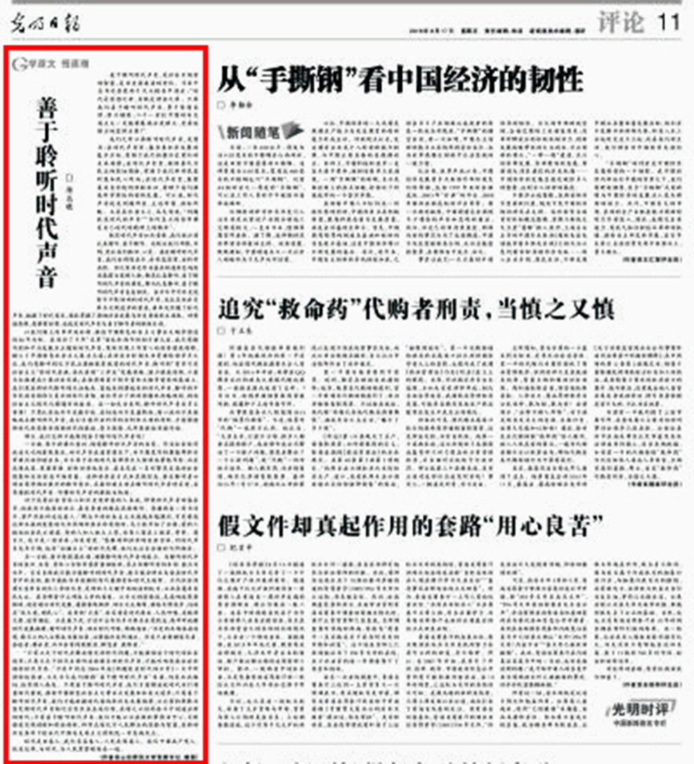 善于聆听时代声音,是社会引领者的智慧,是历史创造者的责任。习近平总书记在党的十九大报告中指出:“时代是思想之母,实践是理论之源。只要我们善于聆听时代声音,勇于坚持真理、修正错误,二十一世纪中国的马克思主义一定能够展现出更强大、更有说服力的真理力量!”