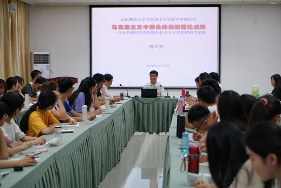 在“习近平新时代中国特色社会主义思想的科学定位”专题报告会中,陈占安从三个方面讲述了马克思主义中国化的最新理论成果——习近平新时代中国特色社会主义思想的科学定位。第一个方面是“习近平新时代中国特色社会主义思想的应运而生”,他认为这一最新理论成果的形成是“时代发出呼唤”“实践奠定基础”“群众参与创造”“领袖成就理论”四个方面结合的产物,并指出,习近平新时代中国特色社会主义思想是党和人民实践经验和集体智慧的结晶,是以习近平的科学思想为主要代表的21世纪的马克思主义、当代中国的马克思主义,是马克思主义中国化的最新理论成果;第二个方面是“具有丰富内涵的科学理论体系”,他强调习近平新时代中国特色社会主义思想具有十分丰富的思想内涵,并从“一个主题”“八个明确”和“十四个坚持”三个不同的角度进行了详细解释,其中他以党的十二大到十九大的主题报告为例,突出证明了中国特色社会主义是我们必须高举的伟大旗帜;第三个方面是“马克思主义中国化又一次飞跃”,通过对于习近平新时代中国特色社会主义思想四个作用——“把对中国特色社会主义建设规律的认识提高到一个新的科学水平”“把对中国共产党自身建设规律的认识提高到一个新的科学水平”“把对中国化马克思主义发展规律认识提高到了一个新的科学水平”“把对人类社会发展规律的认识提高到一个新的科学水平”的精确阐释,他指明习近平新时代中国特色社会主义实现了马克思主义中国化进程的又一次历史性飞跃。