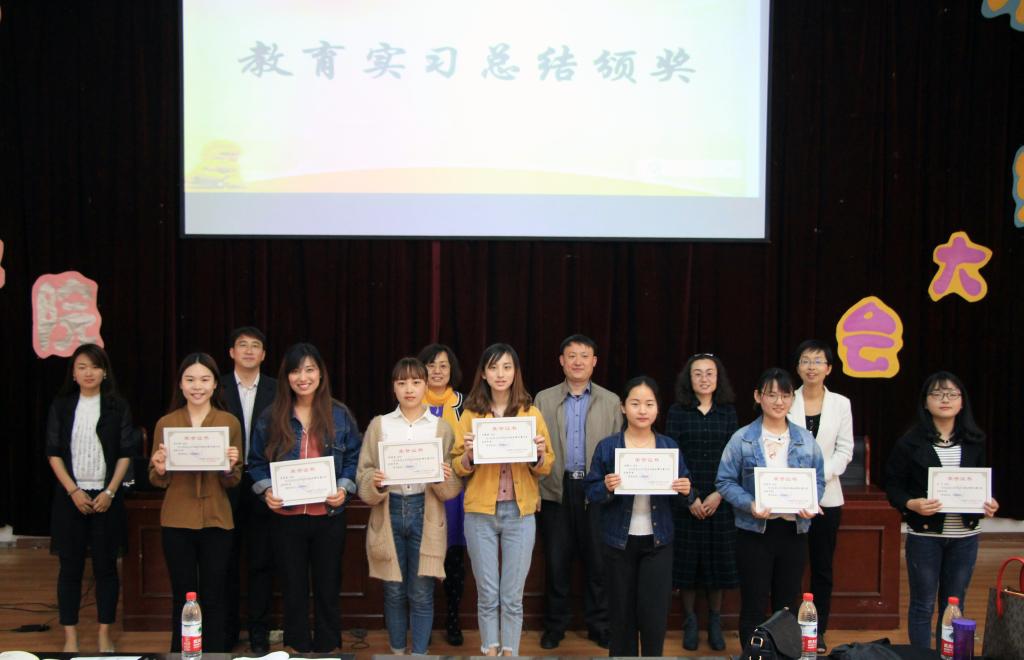 本次教育实习总结大会通过“风采展示”“模拟课堂”“现场直评”等环节,以实时展示交流、总结表彰的丰富形式呈现实习成果,搭建起经验反思和指导分享的平台。会议伊始,同学们首先借短片重温了实习小组集体备课、带领班级跑操及上课的心路历程,回忆起与学生共同求索努力的点滴而百感交集。随后,徐稳就此表达了对实习圆满结束的衷心祝贺,并对同学们从中获取的中学教学技能、中等教育的感性体悟等实战经验提出表扬,其中“师范类学生实现从学生角色到老师角色的转变”一语道出学生真实心声而使之应以雷鸣掌声。在接下来的“模拟课堂”环节,史家亮则通报了实习征文与授课大赛获奖情况,并对“师范生从业技能大赛”和“华文杯”进行动员,颁奖仪式也随之进行。