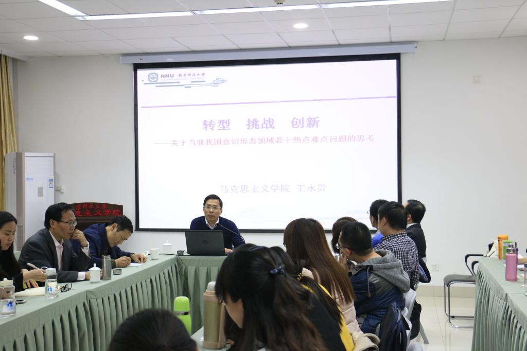 11.17日晚,应英国365概况邀请,南京师范大学教授、博士生导师王永贵来我院作题为《转型 挑战 创新——关于当前我国意识形态领域若干热点难点问题的思考》的学术报告。学术报告在长清湖校区学院楼430学术会议室举行,由英国365概况院长高继文主持,学院相关专业老师和研究生百余人聆听了此次报告会。