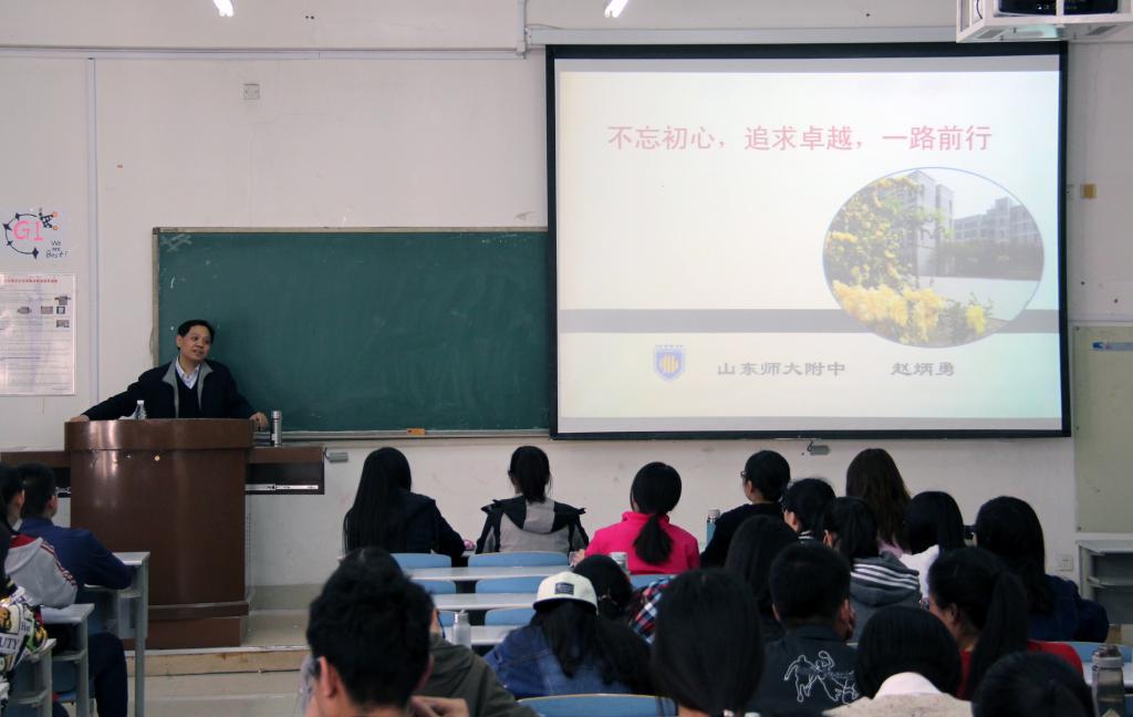聘任仪式结束后,学院硕士生导师、山师附中政治教研组组长、校外导师赵炳勇为同学们带来题为《不忘初心,追求卓越,一路前行》的报告会,学院2014级思政专业的二百余名学生聆听了报告会。针对山东省新高考改革方案即将施行的新形势,报告会围绕“新挑战”“新理念”“新技术”三个话题展开,探讨思政专业的师范生如何将思政教学与新科技融合,应对高中政治教学的压力与挑战,并引领学生反思将核心素养贯穿思政课的重要意义,开拓思政教学的新领域。他强调,政治学科的核心素养是“政治认同、理性精神、法治意识、公共参与”,而教材内容由理论化向素质化的转变,正诠释了创新思维能力和优秀传统文化更有效地融入思政课的巨大实践,对强化教学模式创新,完善社会实践教学模式,优化实践教学体系三方面的改进提供了坚实的内容支撑。最后,他对师范生寄予厚望和鼓励:逆风前行,不忘初心;勇于拼搏,开拓未来。报告会的重点突出、循循善诱,对师范生的实际指导意义重大,同学们纷纷表示受益匪浅。