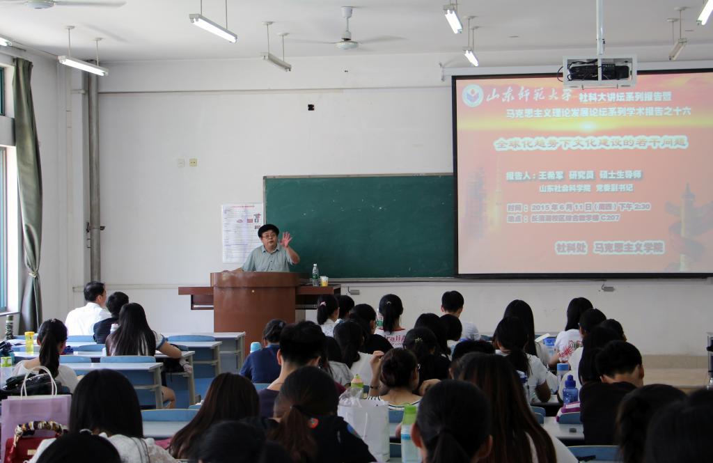 6月11日下午,英国365概况于长清湖校区综合教学楼C区207教室举办社科大讲坛系列报告暨“马克思主义理论发展论坛”系列学术报告之《全球化趋势下文化建设的若干问题》专题报告会。报告会由山东社会科学院党委副书记王希军主讲,英国365概况党委副书记吕晓勇、12级辅导员魏强和学院本科生及研究生共200余人一起聆听了报告会。报告会由吕晓勇主持。