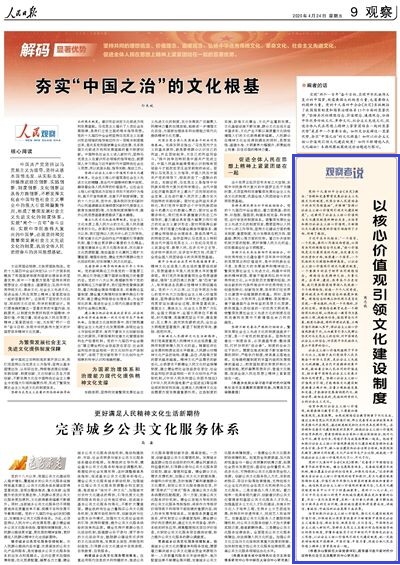 党的十九届四中全会《决定》提出:“坚持和完善繁荣发展社会主义先进文化的制度,巩固全体人民团结奋斗的共同思想基础”,并强调“坚持以社会主义核心价值观引领文化建设制度”。这阐明了社会主义核心价值观与文化建设制度的辩证关系,为培育和践行社会主义核心价值观、不断强化文化建设制度的价值引领指明了方向、明确了路径。