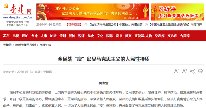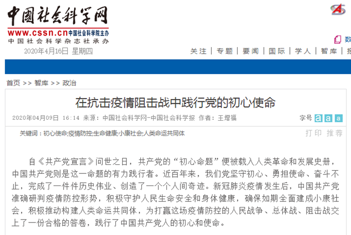 学院教师在“党建网”“中国社会科学网”发表2篇理论文章,对此次全党全民共同抗击疫情提出深刻独到的理论见解。学院院长王增福教授在“中国社会科学网”发表《在抗击疫情阻击战中践行党的初心使命》一文,文中提到“中国共产党准确研判疫情防控形势,积极守护人民生命安全和身体健康,确保如期全面建成小康社会,积极推动构建人类命运共同体,为打赢这场疫情防控的人民战争、总体战、阻击战交上了一份合格的答卷,践行了中国共产党人的初心和使命。”吴春雷副教授在“党建网”发表理论文章《全民战“疫”彰显马克思主义的人民性特质》,他强调紧紧依靠人民、一切为了人民的全民战“疫”总策略,充分彰显了马克思主义鲜明的人民性理论特质。两篇文章在疫情防控中对如何不忘初心使命以及人民中心观的理论研究,进一步引导人们对疫情背景下治国理政的相关理论和策略展开深入思考。