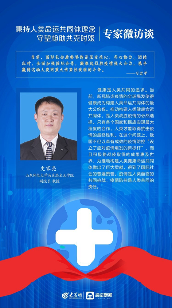 在新冠肺炎疫情全球范围爆发的背景下,人类命运共同体理念更加凸显时代价值。学院副院长史家亮教授受邀参加大众网和海报新闻联合推出的“秉持人类命运共同体,守望相助共克时艰”专家微访谈,史家亮就“推动构建人类健康命运共同体”发表观点。他谈到:“新冠肺炎疫情的全球爆发使得健康成为构建人类命运共同体的最大公约数。推动构建人类健康命运共同体,是人类战胜疫情的必然选择。”同时,他充分肯定了中国积极进行疫情防控的举措,认为中国不但“设立了应对疫情爆发的新标杆”,而且积极将战“疫”取得成果惠及世界,为推动构建人类健康命运共同体做出了巨大贡献。最后他呼吁“疫情是人类面临的共同挑战,疫情防控是人类共同责任”。