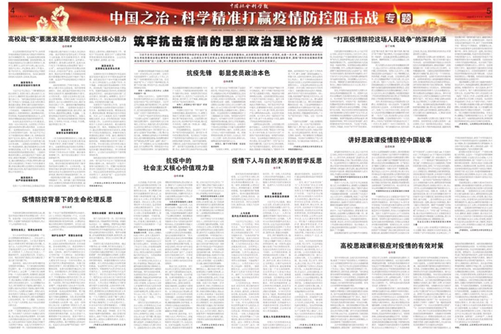 学院教学科研人员以“筑牢抗击疫情的思想政治理论防线”为主题,在《中国社会科学报》通版发表8篇抗击疫情理论文章,从各个角度对疫情防控工作开展理论思考,为高校思想政治理论建设注入新鲜血液。其中,学院党委书记吕晓勇、副书记孙建青发表的《高校战“疫”要激发基层党组织四大核心能力》《抗疫先锋彰显党员政治本色》,通过思考疫情防控中高校基层党组织如何激发四大核心能力以及党员干部如何彰显政治本色和品格,为高校疫情防控党建工作提供理论支持。马永庆教授和王青教授分别从伦理道德和人与自然的关系角度进行反思,以《疫情防控背景下的生命伦理反思》和《疫情下人与自然关系的哲学反思》提醒人们要学会敬畏生命权利、尊重生命价值、提升生命质量,正确处理人与自然的关系。任者春教授、吕松涛副教授、冯芸副教授、丁兆梅副教授以《抗疫中的社会主义核心价值观力量》《讲好思政课疫情防控中国故事》《高校思政课积极应对疫情的有效对策》《“打赢疫情防控这场人民战争”的深刻内涵》,为高校思政课堂与疫情防控的有效结合进行理论上的探索。