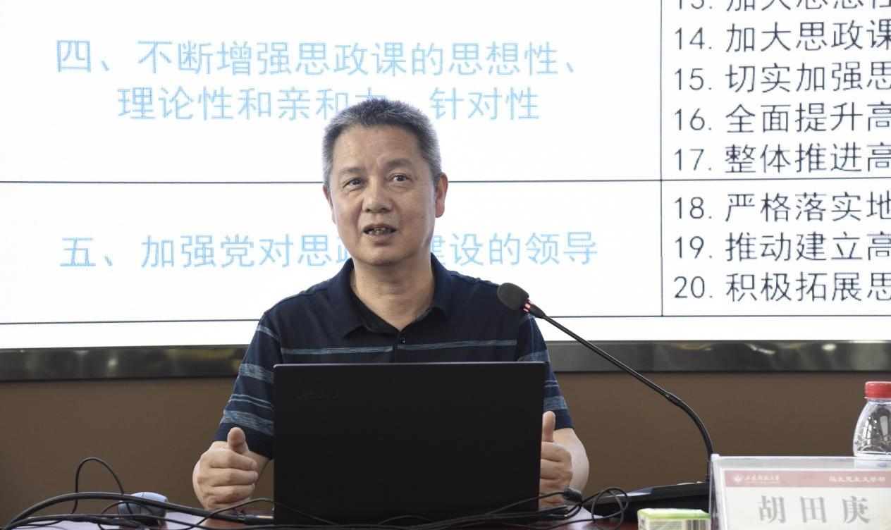 报告会上,胡田庚教授首先系统梳理了近年来思政课改革的重要精神与创新举措。在“如何认识思想政治课深度教学”这一问题上,他强调,思想政治课深度教学就教学内容来说,要突出内容广度、深度和关联度。就学习方式选用来说,突出自主学习、合作学习和建构式学习。