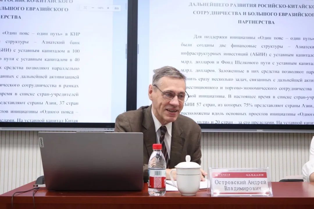 报告会上,安德烈·弗拉基米罗维奇·奥斯特洛夫斯基教授围绕三个方面展开精彩论述。第一,“一带一路”建设的重要性在于能够解决目前中国面临三个问题:一是人口老龄化问题,二是环境污染问题,三是能源短缺问题。第二,中国的五大地区都对当前的“一带一路”建设具有特殊的地位和作用。西北地区未来可能会建立运输中心和科学技术文化中心。东北地区可以构成贯通中国-蒙古-俄罗斯的走廊,有利于中国与蒙古和俄罗斯建立密切经济关系和政治关系。西南地区最大的优点是临近东南亚地区,便于发展贸易。沿海地区经济发展水平较高,是中国最发达的地区。中国的内部地区主要负责发展区域合作,建立铁路运输走廊。第三,俄罗斯是连接欧洲和亚洲非常重要的桥梁,要积极推动俄罗斯远东地区参与“一带一路”建设,今后应开发俄罗斯远东的能源,建立天然气管道;运用亚洲基础设施投资银行重点发展俄罗斯西伯利亚地区的基础设施项目;引进外国劳动力开发西伯利亚和远东地区;利用外国资本在远东和西伯利亚地区建立科学技术园区。