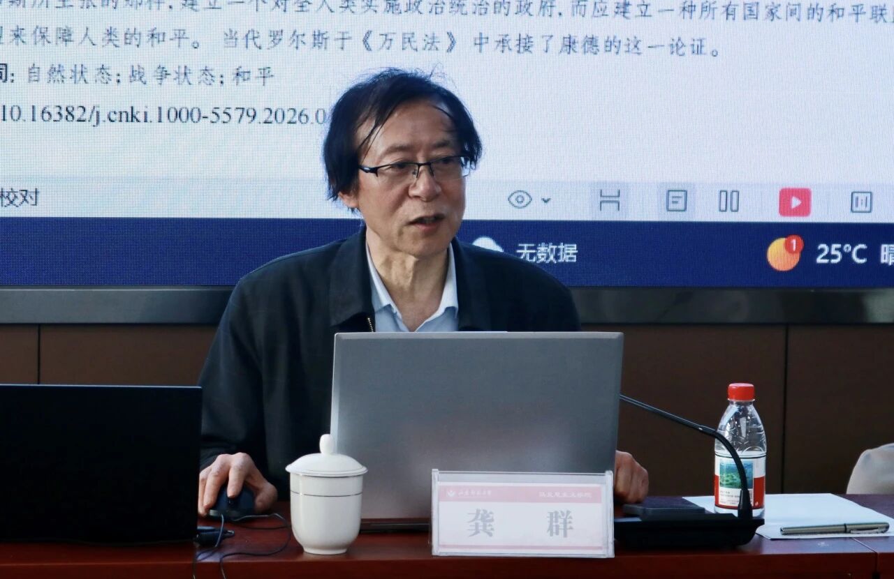报告会上,龚群教授围绕“从寻求和平到寻求永久和平——康德‘永久和平论’的深层逻辑与当代价值”展开精彩论述。首先,龚群教授结合当前国际局势,指出追求和平、实现永久和平、构建人类命运共同体,依然是当今人类共同追寻的理想,康德的永久和平观念至今仍具有重要现实意义。其次,龚群教授从人性根源上详细梳理了霍布斯、卢梭以及康德对于和平与战争状态的不同看法,他指出,康德综合汲取了霍布斯和卢梭的观点,认为人类对和平及永久和平的追求,是由人的恶的本性与人的理性所具备的完善化追求能力共同促成的必然趋势。最后,龚群教授指出,和平并非自然存在,需通过人为建构得以实现,康德尤为注重国际层面的和平建构,提出了和平联盟的构想,主张以国家间联合的力量遏制战争、保障和平,从而实现从国内和平到人类永久和平的跨越。