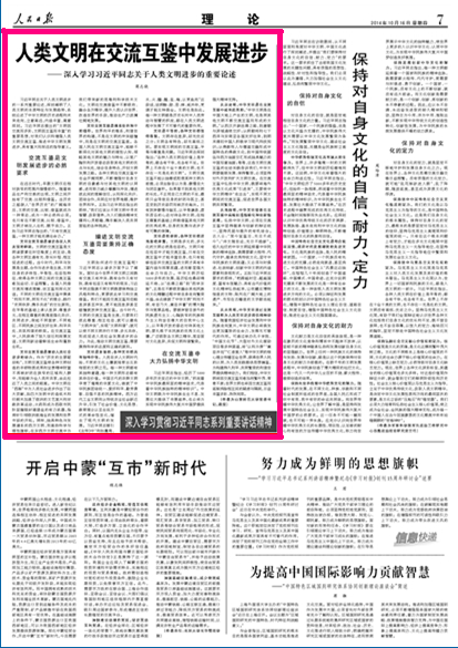 10月16日,《人民日报》理论版刊发了我校商志晓教授的文章《人类文明在交流互鉴中发展进步——深入学习习近平同志关于人类文明进步的重要论述》,这是继作者10月1日在《光明日报》头版发表的《中国特色社会主义道路的历史必然、非凡意义与广阔前景——写在庆祝中华人民共和国成立六十五周年之际》的文章后,在我国最高级别的报纸上发表的又一力作。文章一经发表,备受关注,人民网、光明网、新浪网等各大网站迅即转载。