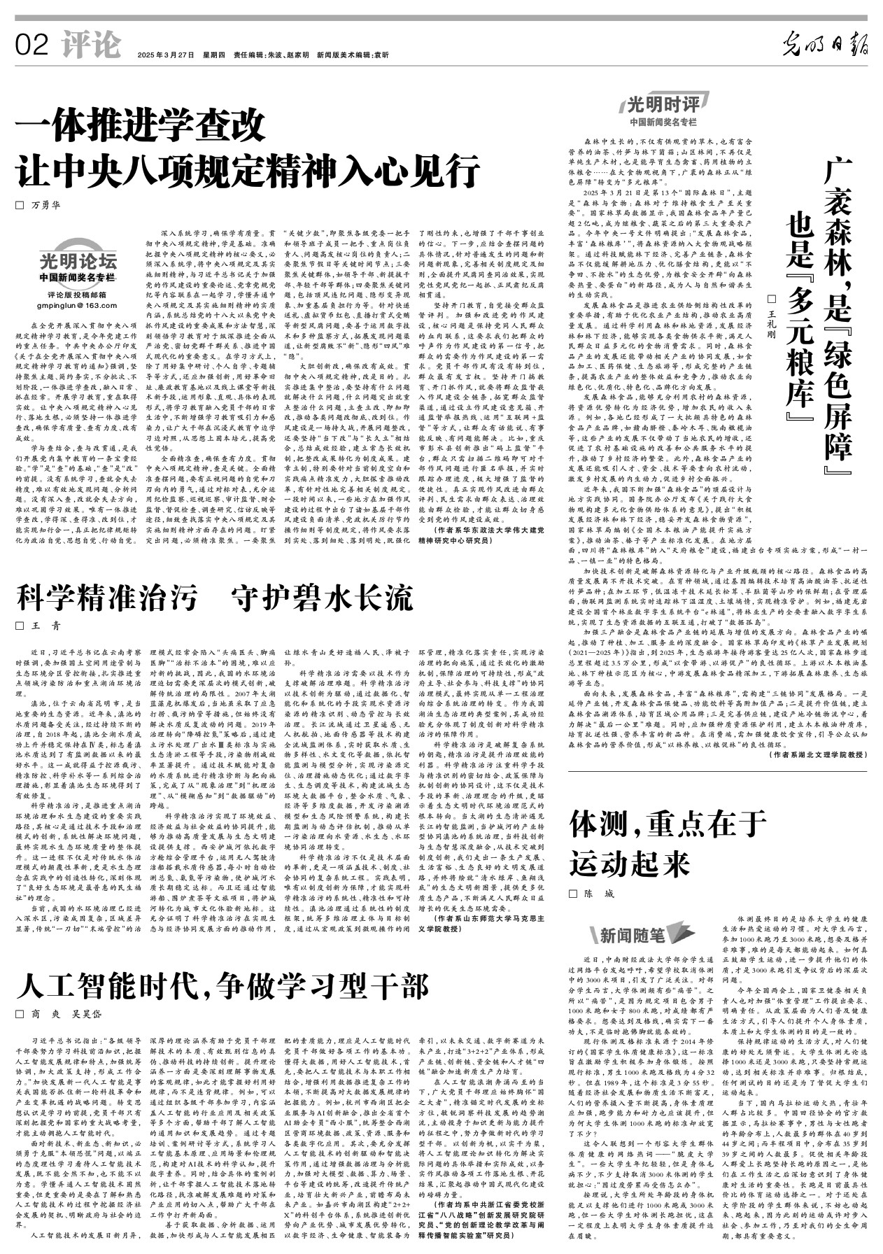2025年3月27日,《光明日报》刊发学院王青教授的文章《科学精准治污 守护碧水长流》。全文如下:
