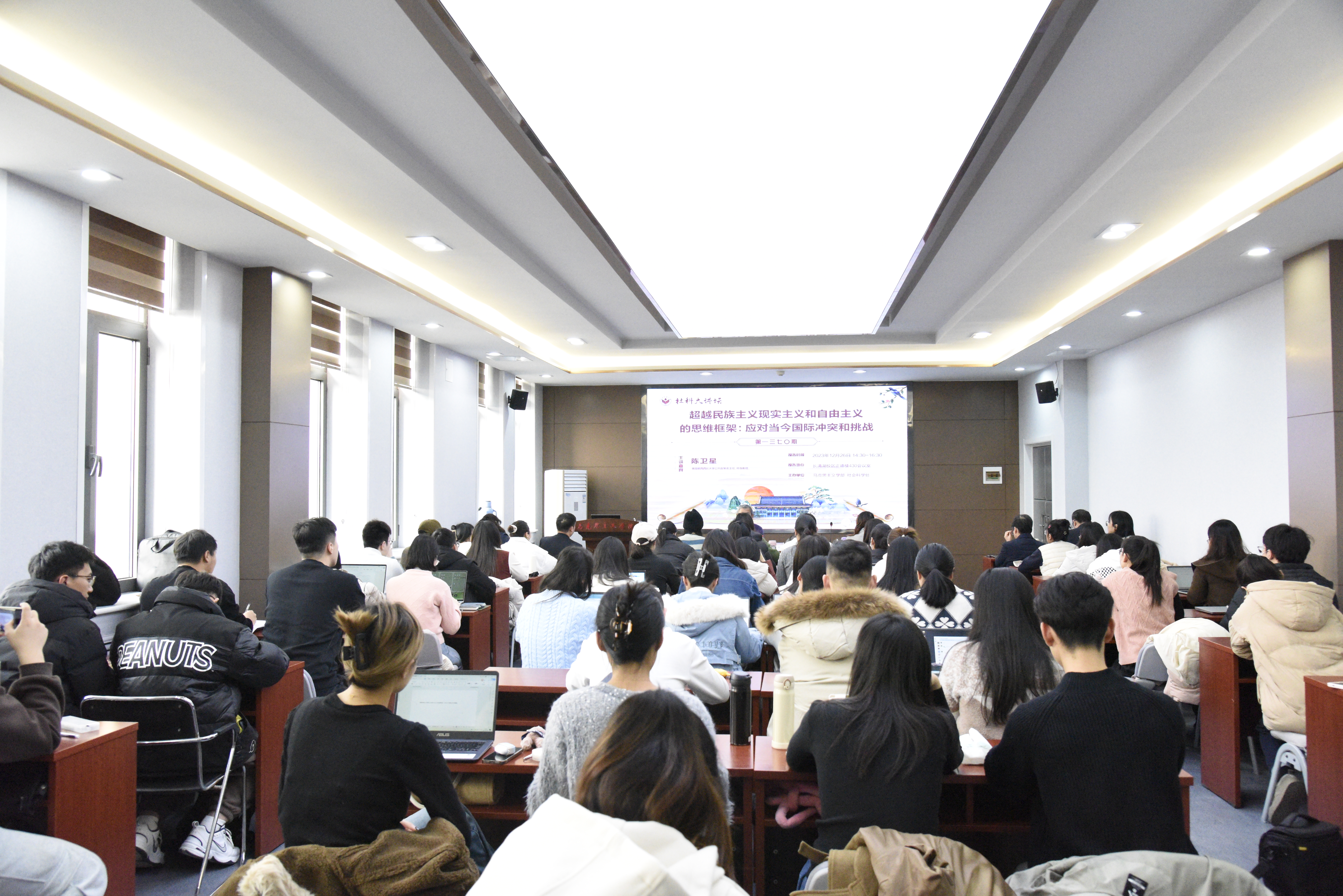 紧接着,陈卫星教授围绕“超越民族主义、现实主义和自由主义的思维框架:应对当今国际冲突和挑战”这一主题,从三个方面进行具体阐述。一是批判现实主义思维。陈卫星教授指出,冷战结束以后,地缘政治重新兴起,大国政治重新回到国际舞台,现实主义的影响更加凸显。然而强调实力的现实主义既无法应对传统的冲突,也无法应对未来的挑战。二是超越民族主义思维。陈卫星教授指出,各民族有着不同的文化、传统、价值与习惯,但不应以冲突定义民族主义,民族主义强调的应是文明的多样性。尽管各国文明与文化传统价值不同,但存在共同的人类文明。从政策来看,人类面临教育、退休养老、医疗环境、预算等共同的政策挑战。从国际环境来看,保护生态环境、推动可持续发展是各国的共同责任。从技术革命角度来看,科技革命发展到当下,不仅对某一国家的发展提出了挑战,也对整个人类社会提出了挑战。因此,在当前社会应当超越民族主义中冲突的旧思维,尊重人类文明的多样性,聚焦共同发展。三是超越自由主义思维。陈卫星教授指出,民主和马克思主义都关心普通大众,不同的政体可以用不同的方式为人民服务。因此,要摒弃自由主义和非自由主义对立的简单思维方式,建立能够满足各国生存、安全、稳定、发展等最基本、最实质的需求的崭新国际秩序,突破传统的思想框架,建立新的思维框架。陈卫星教授强调,建立自由主义的秩序并不是自由主义和民主的概念和理想,更重要的是解决具体的挑战。报告会最后,与会师生踊跃提问,陈卫星教授给予了细致全面的解答,帮助与会师生开阔了国际视野,提升了思维能力。