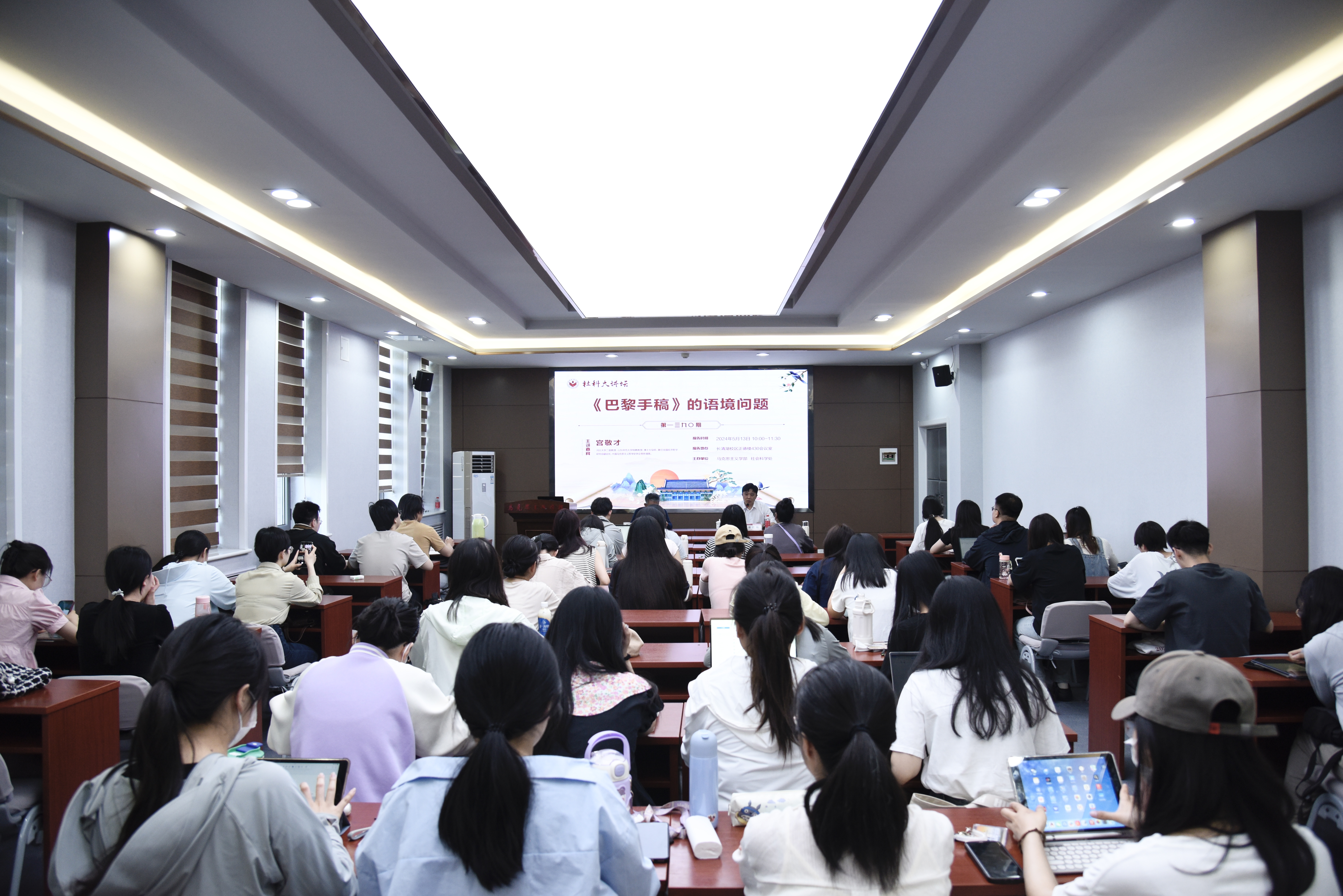 紧接着,宫敬才教授从三个层面向与会师生澄清了一系列在《巴黎手稿》相关研究上的误区。第一,《巴黎手稿》与《1857—1858年经济学手稿》和《资本论》构成历史逻辑和理论逻辑皆然的三点一线关系。宫敬才教授认为,《巴黎手稿》是马克思广义政治经济学研究的第一部文献,为《1857—1858年经济学手稿》和《资本论》的写作奠定基础;第二,从写作目的、研究对象、思想资源的利用以及学科知识储备等方面来看,《巴黎手稿》的语境是经济哲学语境而非纯哲学语境。宫敬才教授认为,马克思写作《巴黎手稿》是为了揭示一系列政治经济学、哲学等的问题,其研究对象除黑格尔哲学和费尔巴哈哲学以外,还包括资产阶级经济学以及恩格斯的《国民经济学批判大纲》。马克思在对黑格尔经济哲学进行批判的基础上,大量引入政治经济学的内容对资产阶级进行了质疑和批判;第三,从经济哲学语境角度看,《巴黎手稿》具有全新的意义天地。宫敬才教授认为,在《巴黎手稿》中,马克思看到了黑格尔哲学中的劳动辩证法,发现了经济现象的哲学分析框架——主客体关系,发现了政治经济学的逻辑前提——完整的人、法哲学前提以及政治哲学前提,提出了人化的自然界、劳动哲学本体论、方法论历史唯物主义、人学历史唯物主义等一系列重要思想,具有十分重要的历史贡献。报告会最后,学部师生踊跃提问,宫教授对相关问题予以细致解答,为与会师生提供了进一步的思想启示。