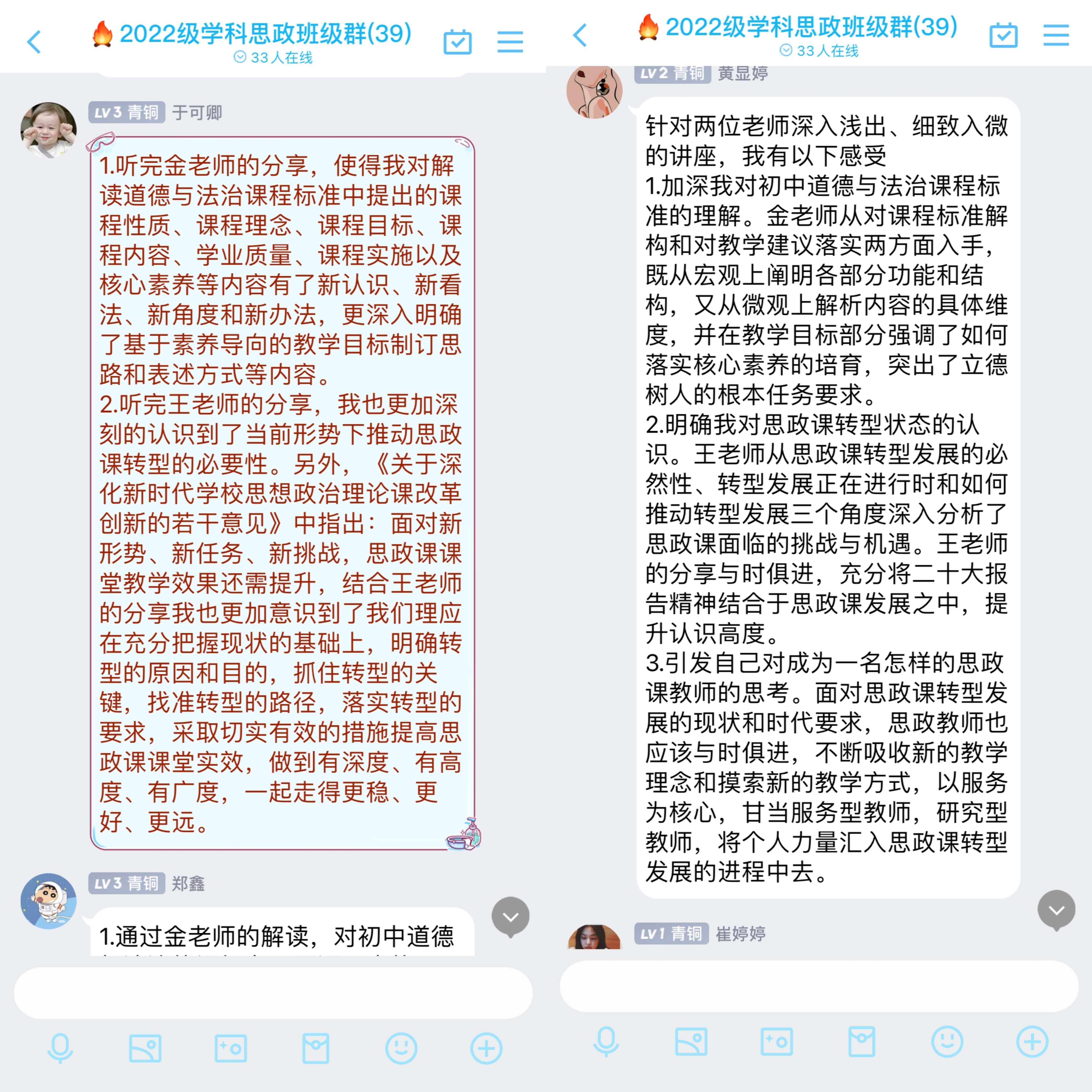 同学们纷纷表示在本次论坛中受益匪浅,积极分享交流自己的感悟与收获。2022级学科教学(思政)研究生韩雅雯同学分享到:“通过本次讲座接触到了许多之前未深入学习的新知识,有助于我们更深入地理解新修订的初中道德与法治课标与高中思想政治课标均体现了思政课‘一脉相承的坚守’和‘与时俱进的追求’。同时接触到了许多之前未深入学习的新知识,收获颇丰。”