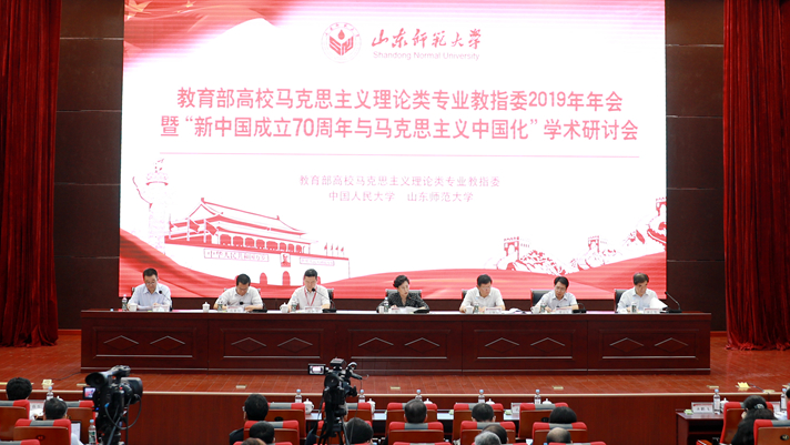 8月26日,由教育部高校马克思主义理论类专业教指委、中国人民大学和英国365集团公司主办的教育部高校马克思主义理论类专业教指委2019年年会暨“新中国成立70周年与马克思主义中国化”学术研讨会在英国365集团公司举行。中国人民大学党委书记、马克思主义理论类专业教指委主任委员靳诺,教育部社科中心主任王炳林,教育部高等教育司二级巡视员、文科处处长武世兴,山东省委教育工委常务副书记、省教育厅厅长邓云锋,山东省委宣传部副部长孔繁轲,校党委书记、马克思主义理论类专业教指委副主任委员商志晓等出席开幕式。开幕式由中国人民大学党委副书记、教指委秘书长齐鹏飞主持。教育部高校马克思主义理论类专业教指委全体委员,国内高等学校、科研机构的百余位马克思主义理论专家学者,部分国家级和省内重要报刊编辑部负责同志出席会议。校长曾庆良、副校长万光侠参加有关活动。