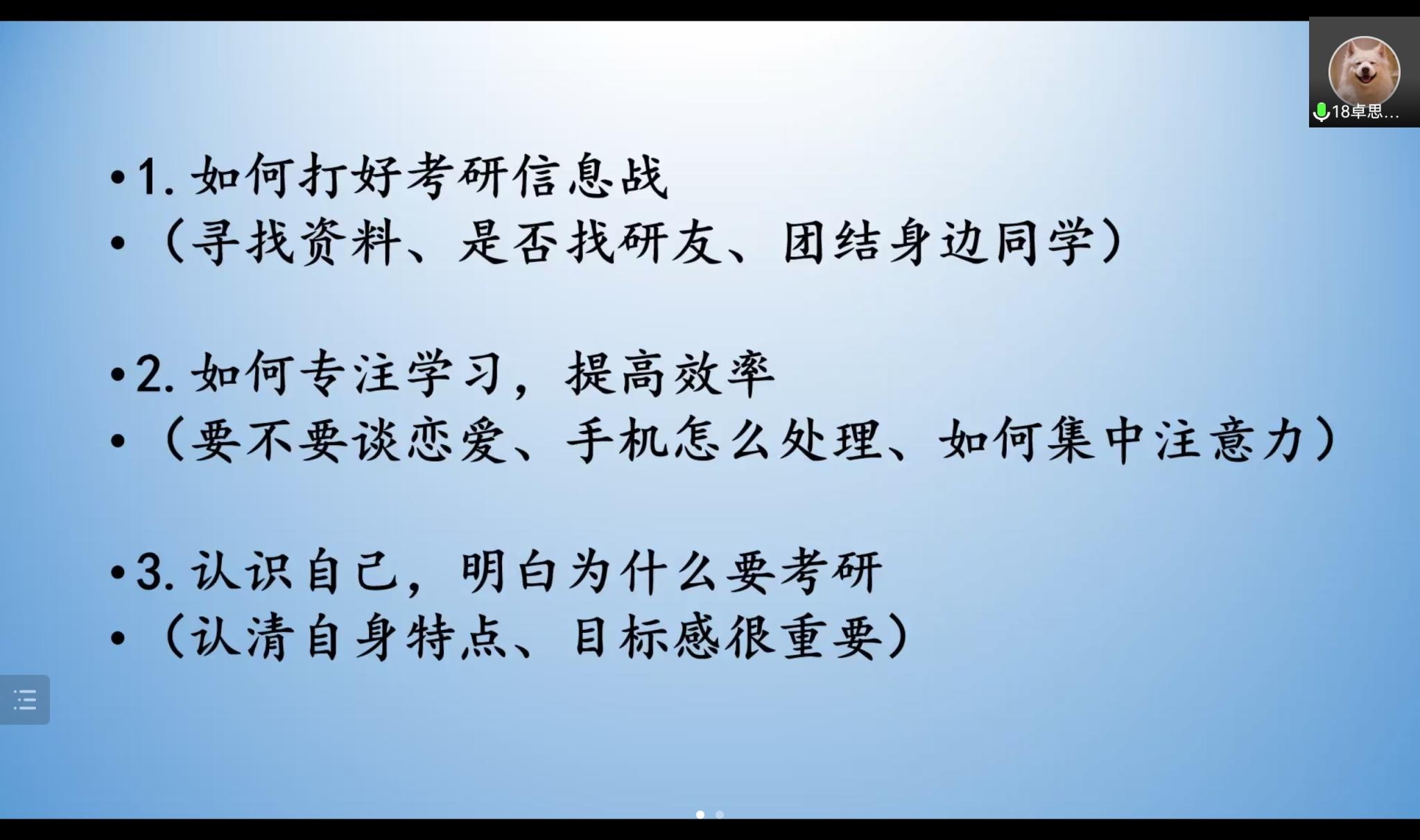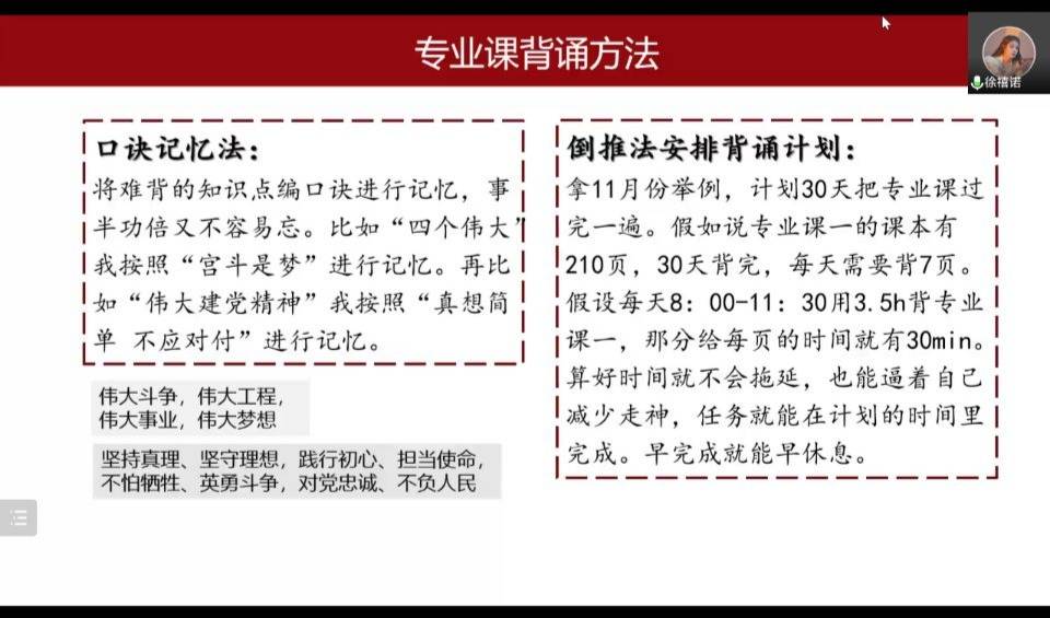 此次会议分为经验分享、提问回答两个环节。首先,蓝心雨从“公共课”“专业课”“时间规划”“心态调整”四个方面细致详尽地介绍自己在备考期间所用书籍和网课资料,并着重强调了结合自身情况安排备考计划的重要性。接下来,徐禧诺主要分析了各个学校与专业的情况,并对如何选择考研学校这个问题提出合理化建议。她说道:“选择考研院校之前可以通过查看院校真题、浏览经验贴等方式对自己的能力进行准确定位,从而增大考研上岸概率。”随后,张欣雨以自身备考经历为切入点,分享了专业课复习方法,她细致的讲解和满满的热情让在场同学信心倍增。最后,同学们围绕备考策略和考研环节等问题与主讲人进行了深入交流。