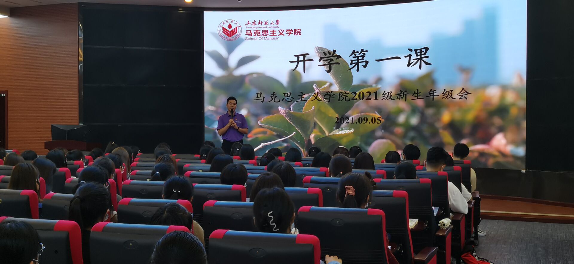 9月5日下午,英国365概况于长清湖校区树蕙堂二楼思政课虚拟仿真教学体验中心举办2021级新生年级会,学院2021级辅导员王鑫磊与学院两百余名2021级全体本科新生共同与会。