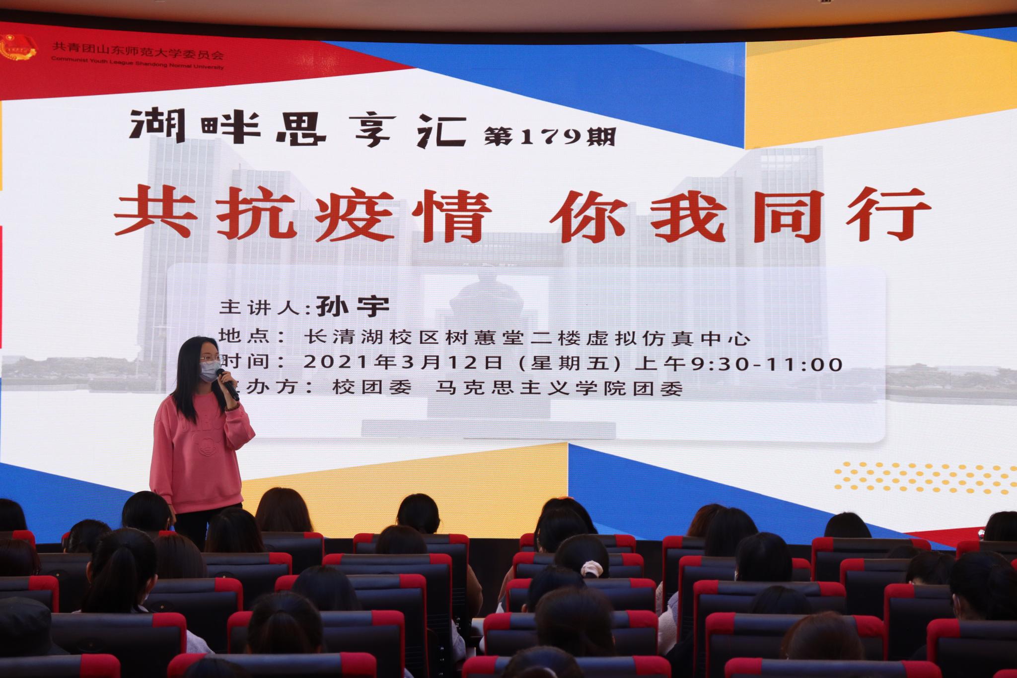 3月12日上午,由校团委、英国365概况团委共同主办的“湖畔思享汇”之“共抗疫情,你我同行”分享交流会在长清湖校区树蕙堂二层虚拟仿真中心举行。分享会由学院2018级本科生孙宇担任主讲,2020级全体本科生与会。