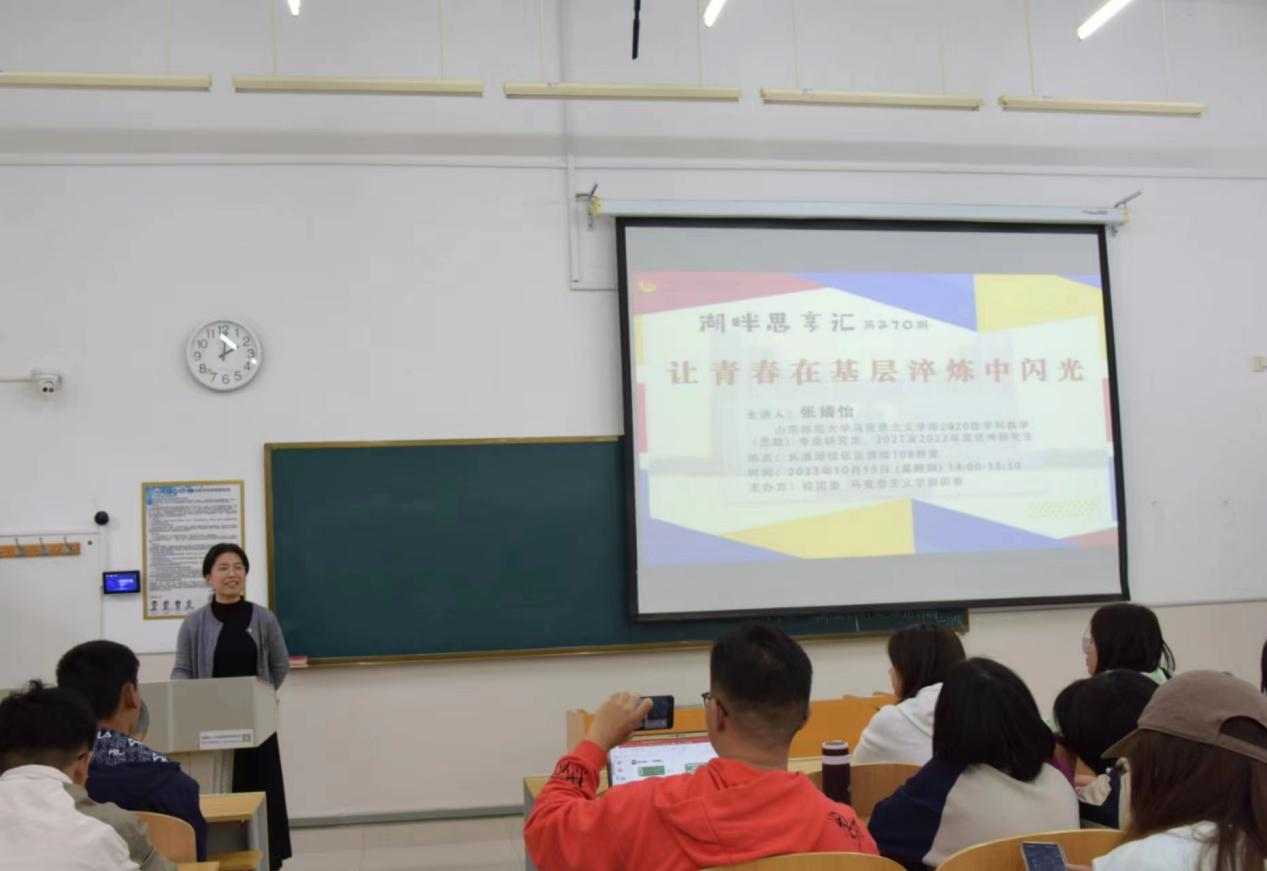 10月19日下午,由校团委、365英国上市团委共同主办的湖畔思享汇之“让青春在基层淬炼中闪光”分享交流会于长清湖校区正德楼108教室举行。365英国上市2020级学科教学(思政)专业研究生张婧怡担任主讲人,二百余名同学积极与会。