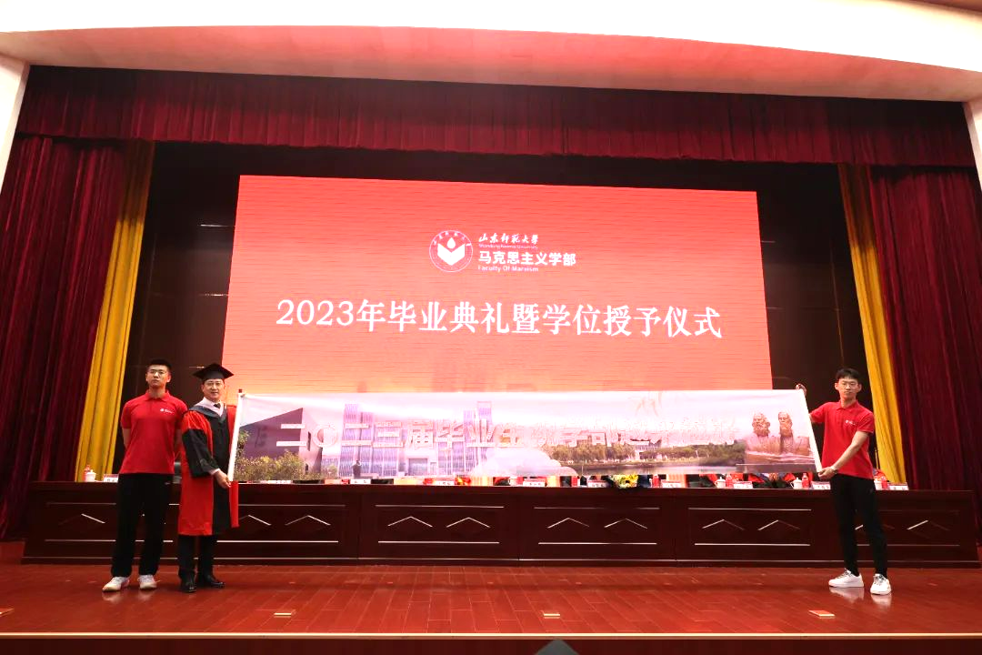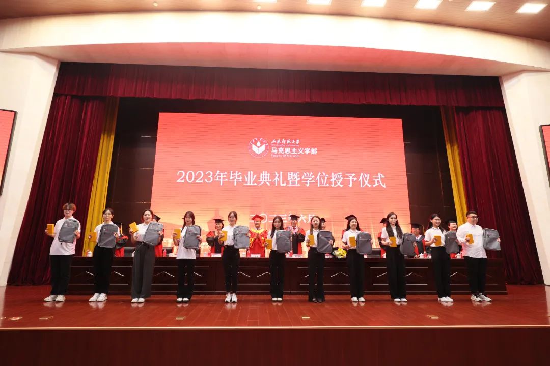 典礼上,老师与毕业生们的“情谊互赠”将现场气氛再次推至高潮。学部为每一位毕业生准备了两份纪念品——一个印有院标的书包,一份配有精美青铜书签和如意样式的优盘,以此勉励和祝愿同学们以书为伴,万事顺意。接着,2023届全体毕业生也为学部送上了一幅饱含深情的作品——“字成一心”,学院党委书记吕晓勇代表学部接受了毕业生的一片情谊。作品中,一个个熟悉的名字紧密联系在一起,喻示着无数个小我共同组成学部这个温暖的大家庭,虽然今日即将远航,但大家始终心连心,彼此牵挂。一个个熟悉的场景,寓意在山师共同度过的点滴岁月,深情厚谊都藏在短短的祝福中,衷心祝愿母校和学部越办越好、蒸蒸日上、桃李满天下。