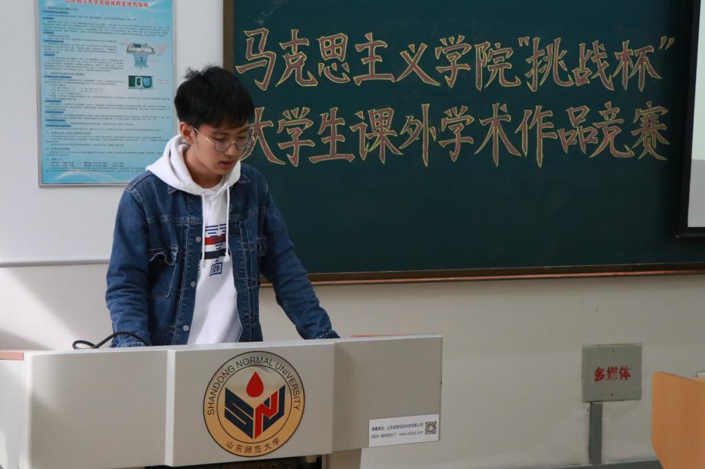 比赛过程中,九支队伍分别介绍了各自项目的研究背景、研究方法、研究过程并提出了最终结论,接着由评委老师对每支队伍进行提问、点评和指导。其中,项目负责人2018级思政二班宋旭东介绍了项目“重大突发事件下大学生制度自信教育现状与对策分析——基于驻济高校的调查”。该项目组从大学生、一线思政教师、学生工作者、基层宣传工作者四个主体入手,结合实地考察、问卷调查、访谈三种形式,进行样本分析后得出大学生拥有坚定的制度自信的结论,之后提出了相关工作进行革新的建议。在点评环节,评委老师指出了各队伍的优点与不足并提出了改进的建议。最后,根据各队伍的综合表现和评委老师的讨论结果,九支队伍均获得参加校级比赛的资格。